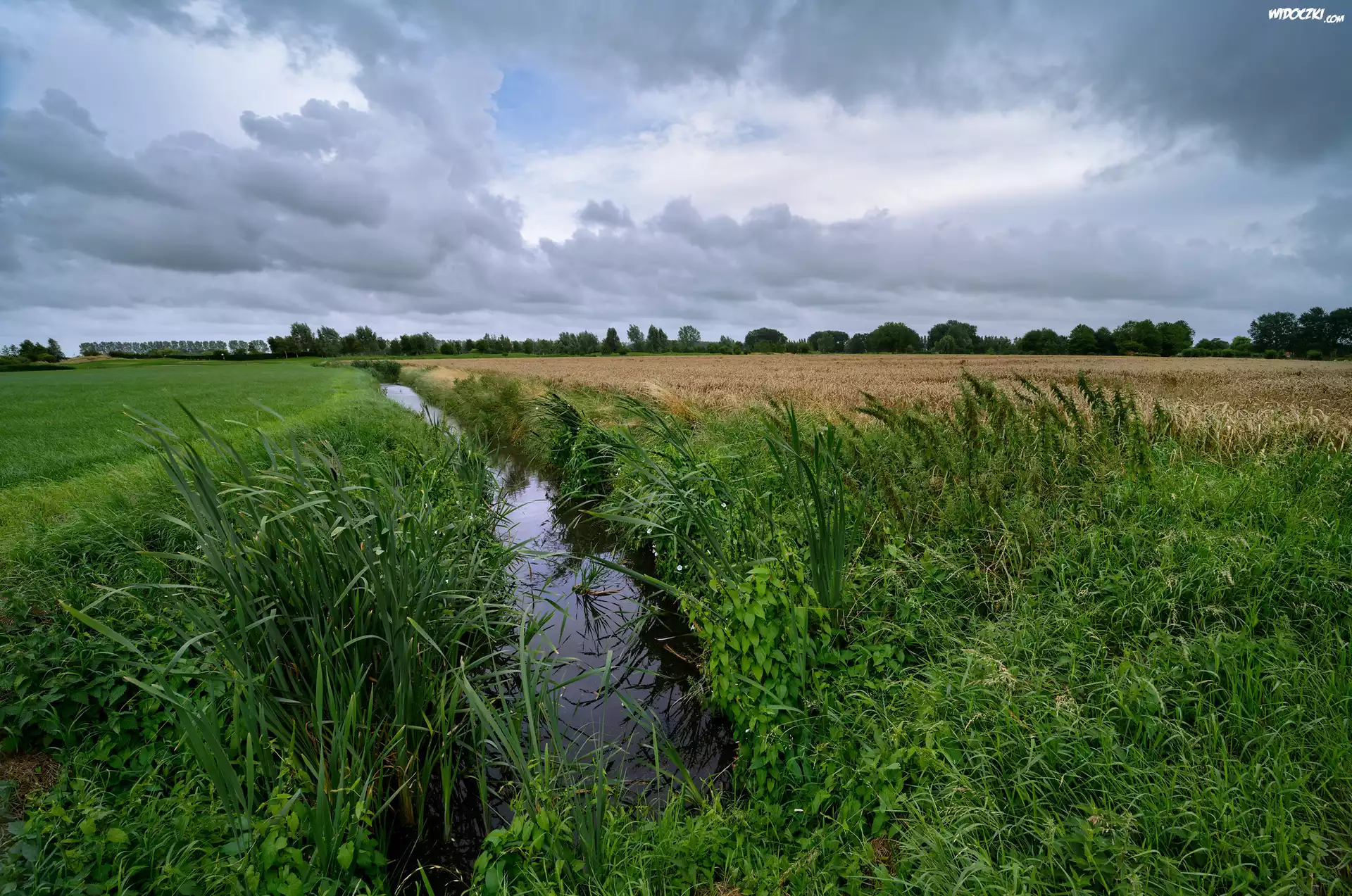 Rów, Łąka, Trawa, Pole, Zboże, Drzewa