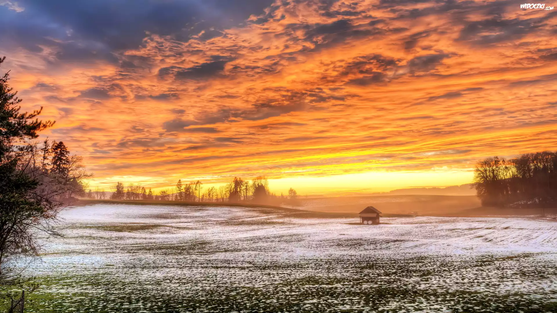 Pole, Zima, Zachód słońca, Drzewa, Niebo