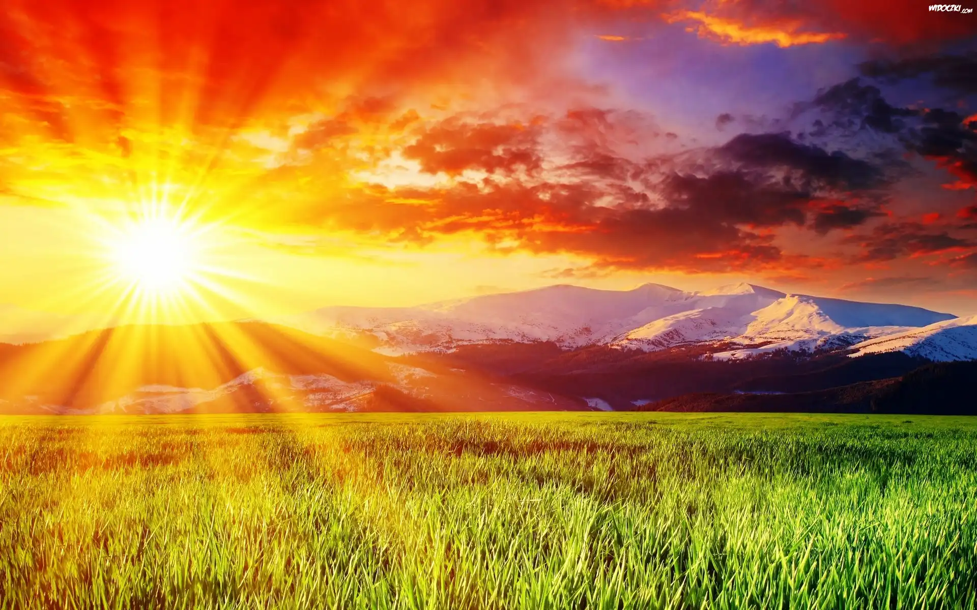 Pole, Słońce, Góry, Chmury