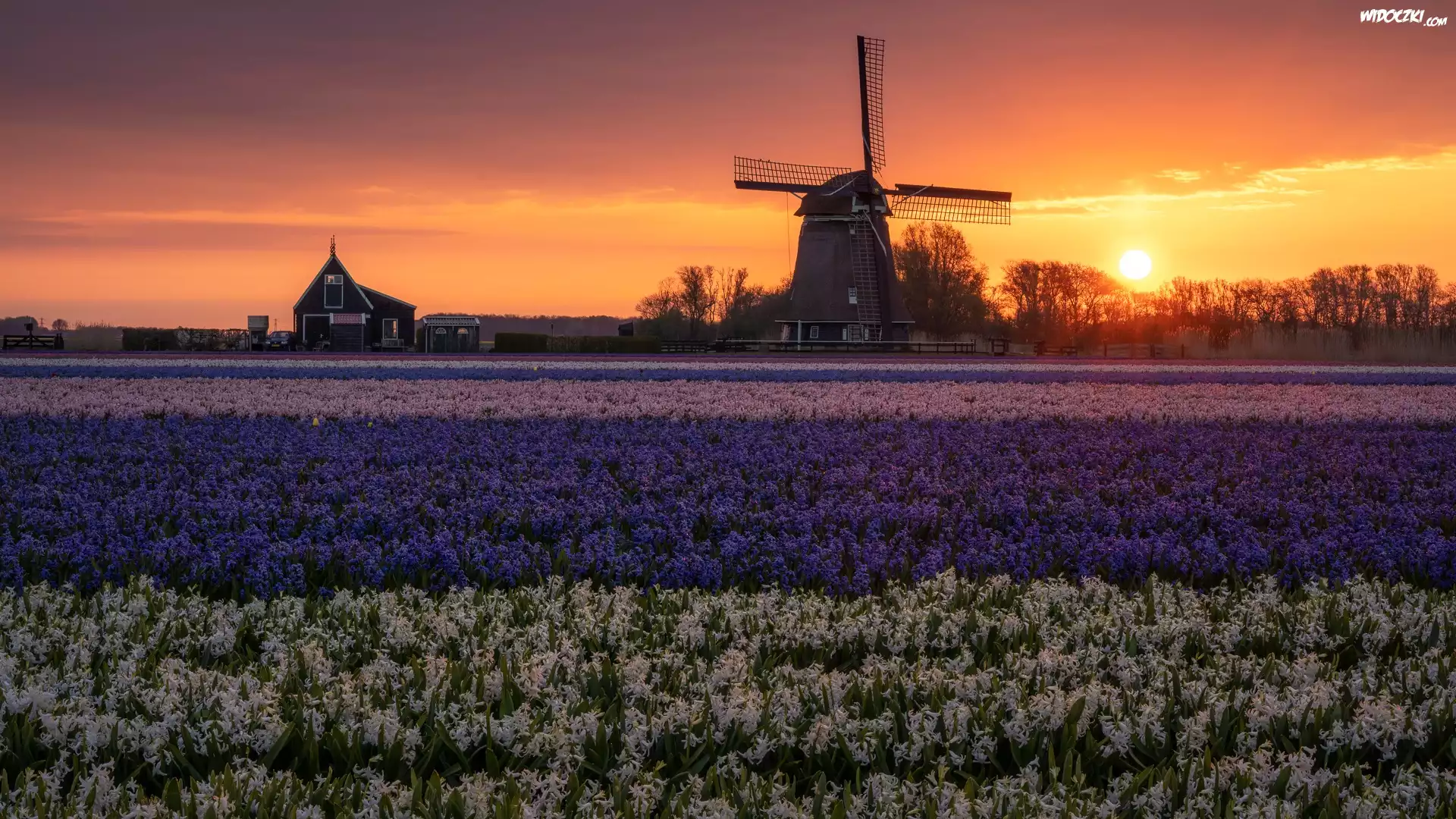 Zdjęcia, Wiatrak, Kwiaty, Hiacynty, Pole, Drzewa, Zachód słońca