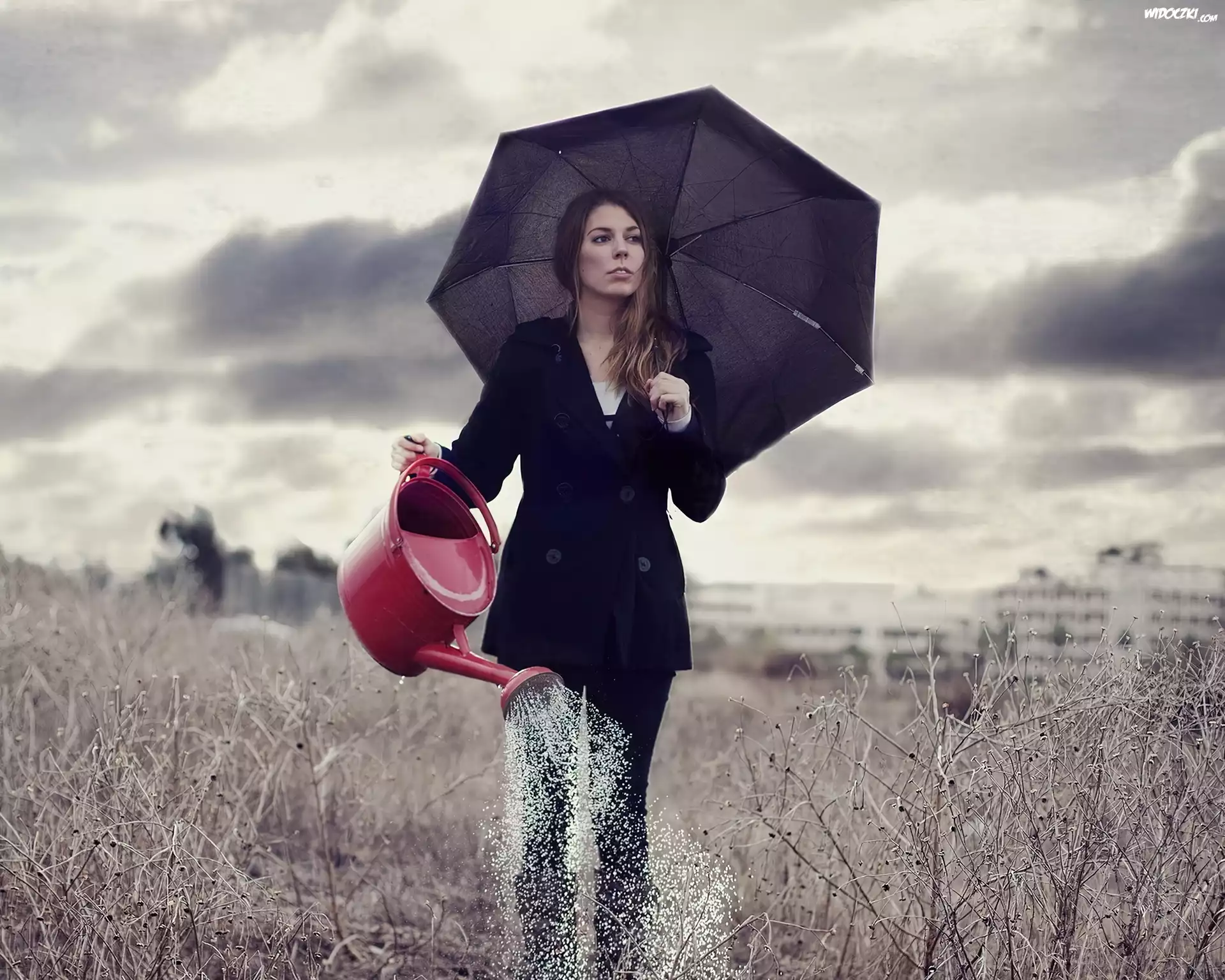 Zdjęcia, Kobieta, Pole, Czarna, Parasolka, Czerwona, Konewka, Woda