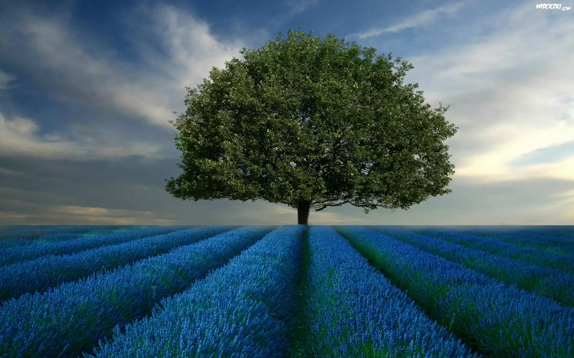Zdjęcia, Lawendowe, Pole, Drzewo