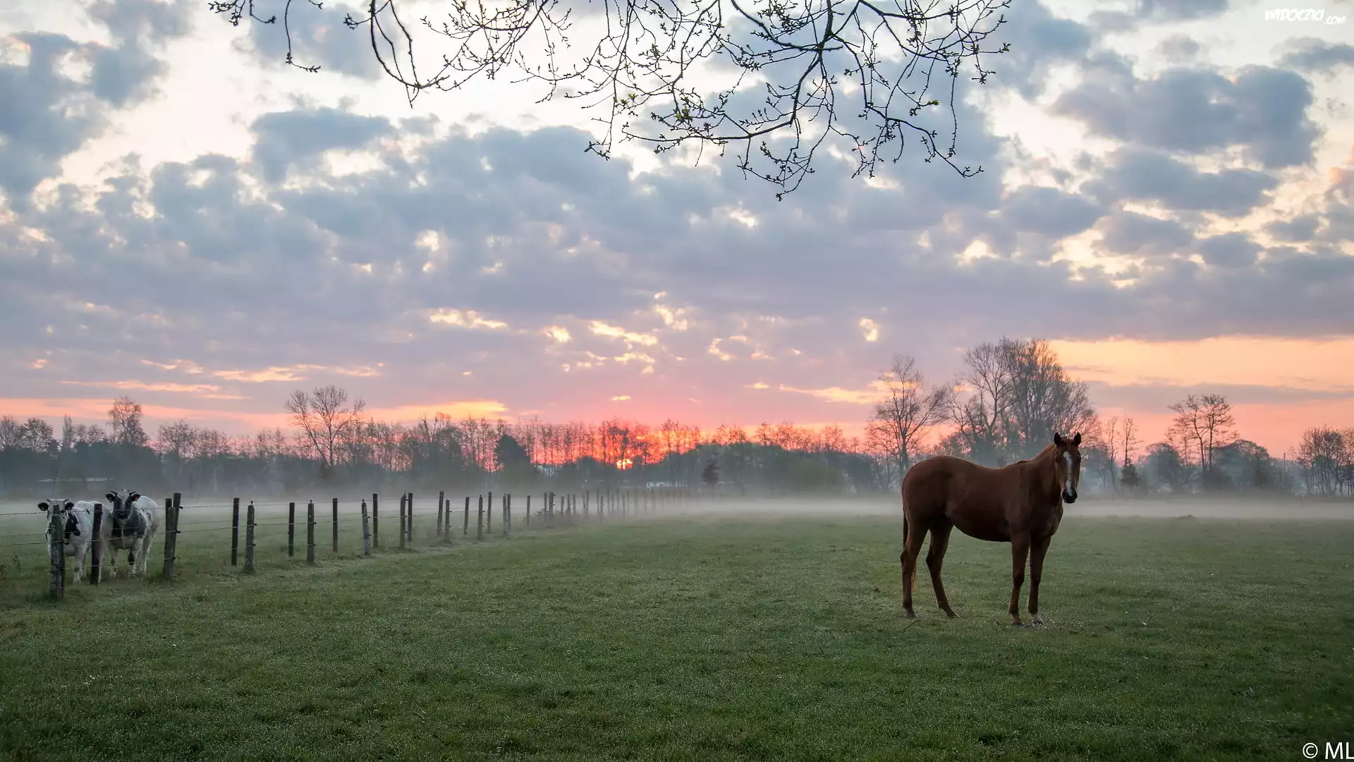 Zdjęcia, Łąka, Pole, Drzewa, Mgła, Wschód słońca, Ogrodzenie, Płot, Koń, Krowy