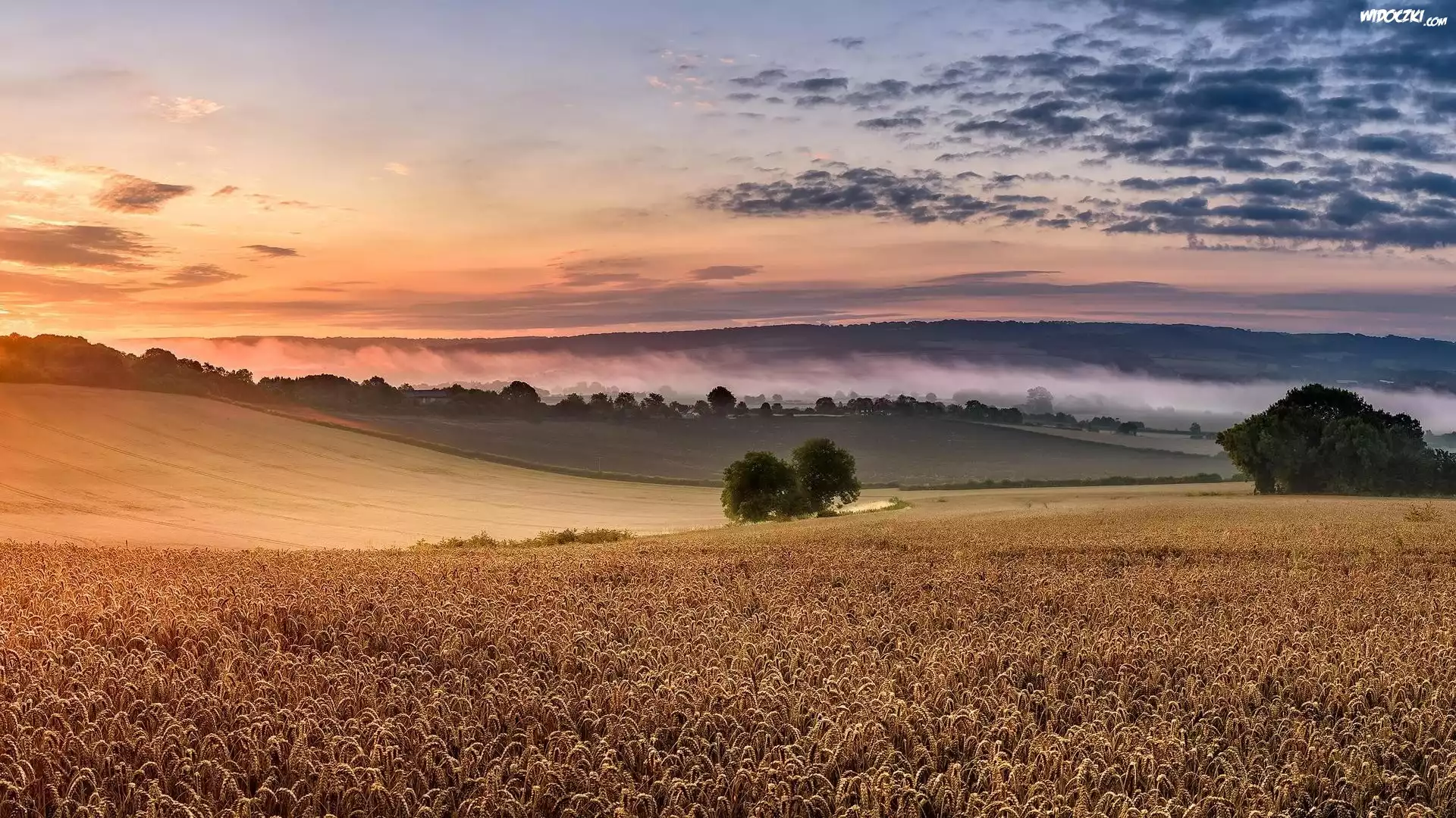 Zdjęcia, Pole, Zboże, Mgła, Drzewa