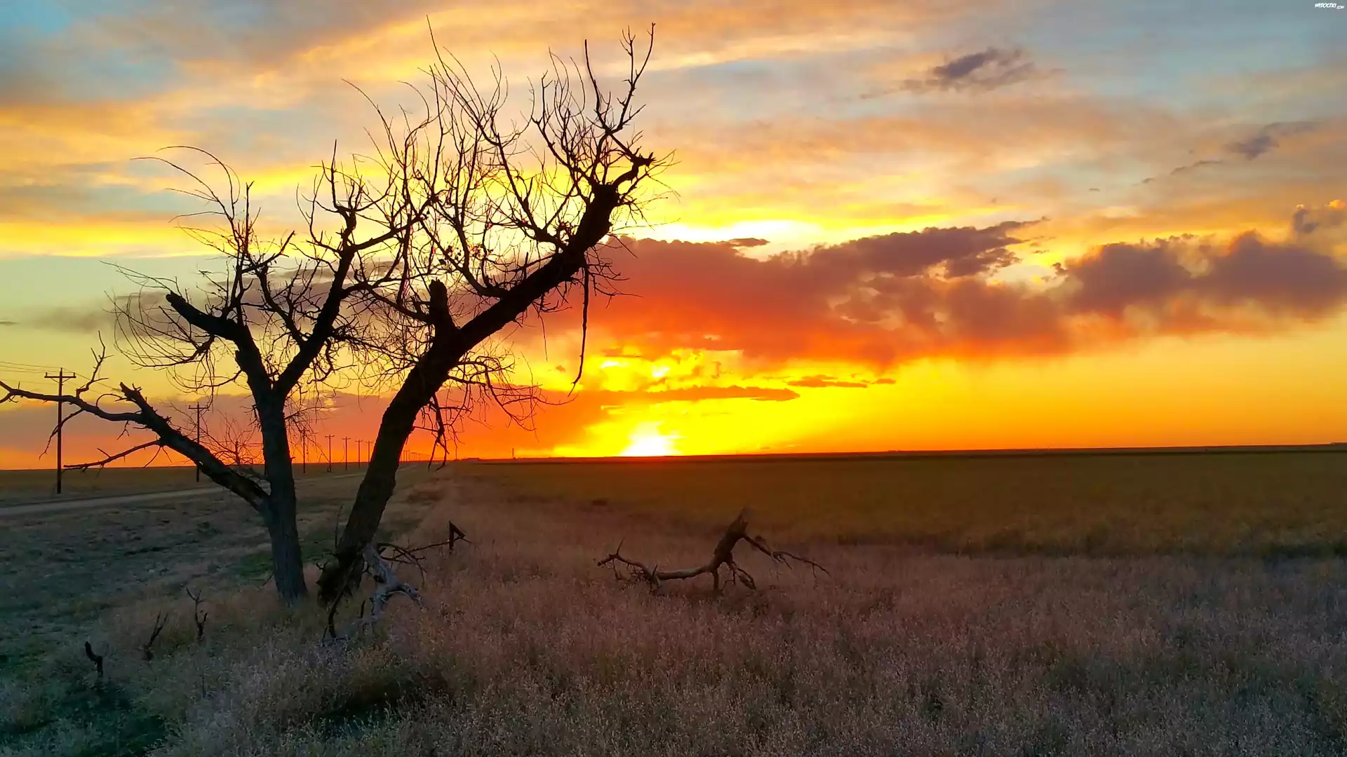 Zdjęcia, Pole, Zachód słońca, Niebo, Drzewo