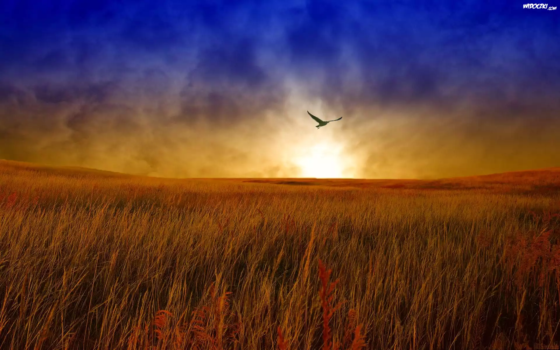 Zdjęcia, Pole, Trawy, Niebo, Ptak