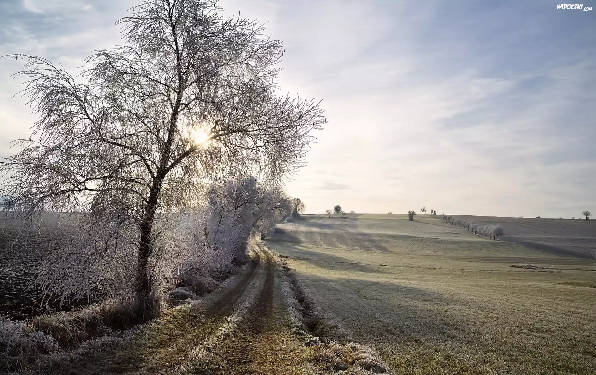 Zdjęcia, Pole, Drzewa, Poranek, Szron