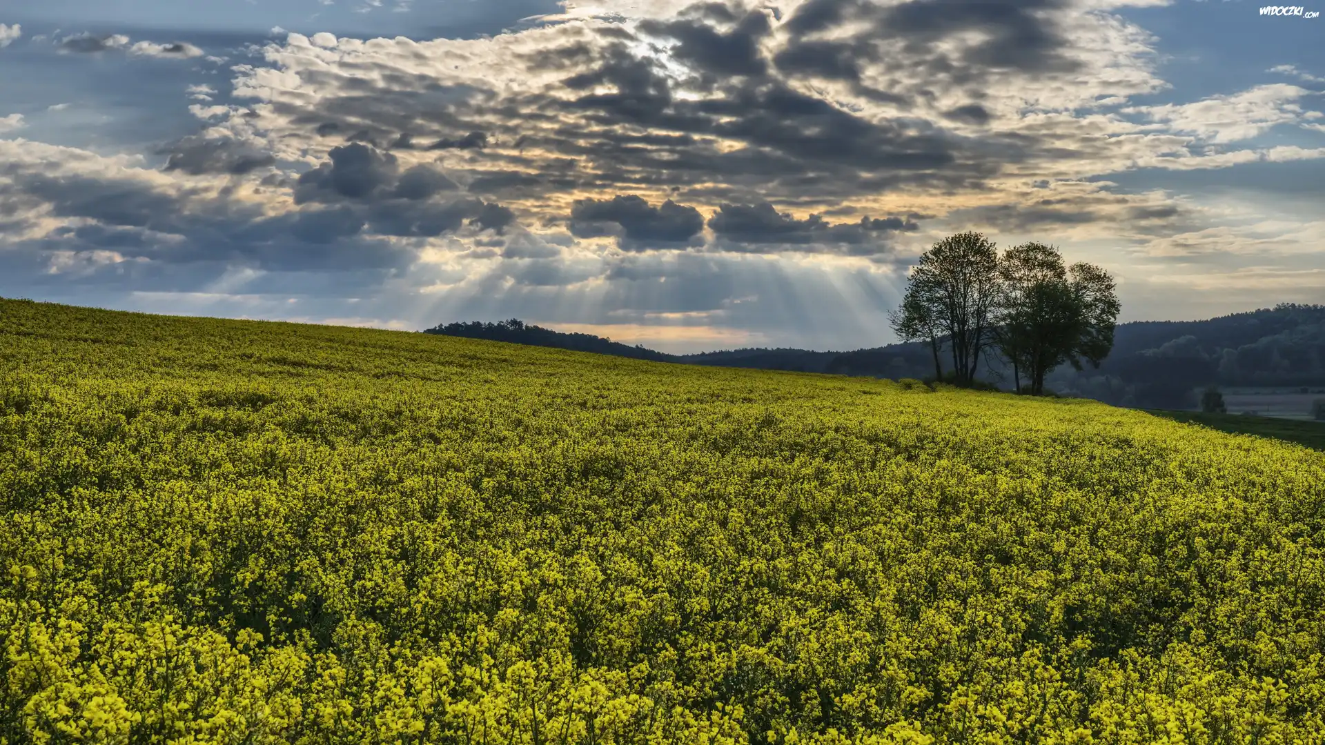 Zdjęcia, Pole, Rzepak, Drzewa, Promienie słońca