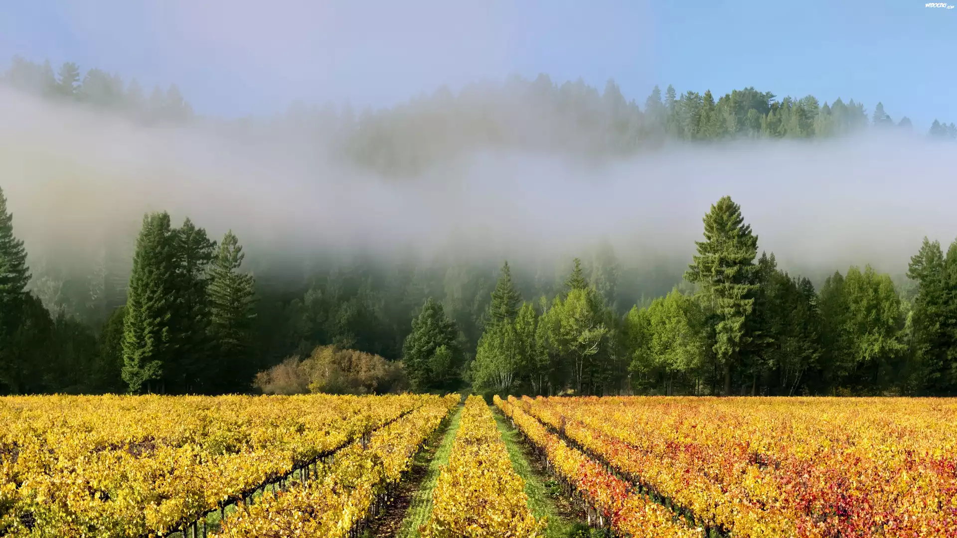 Zdjęcia, Drzewa, Pole, Ścieżka, Las, Mgła