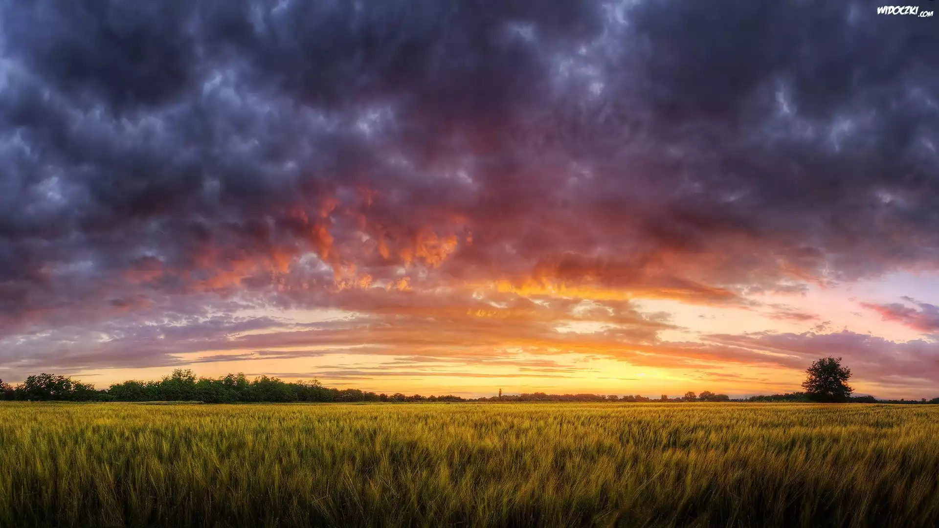Pole, Chmury, Zachód słońca, Drzewa