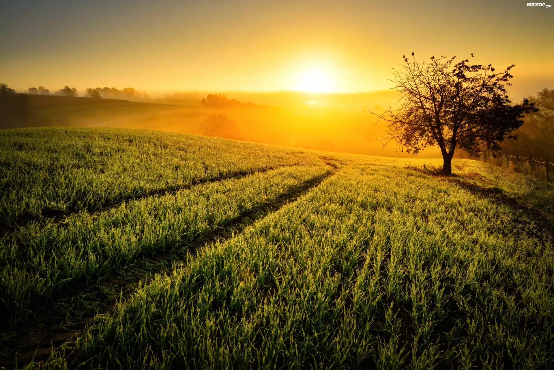 Zdjęcia, Pole, Zachód słońca, Drzewo