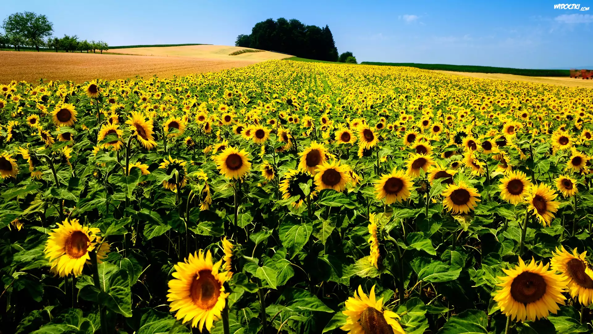 Słoneczniki, Pole, Drzewa