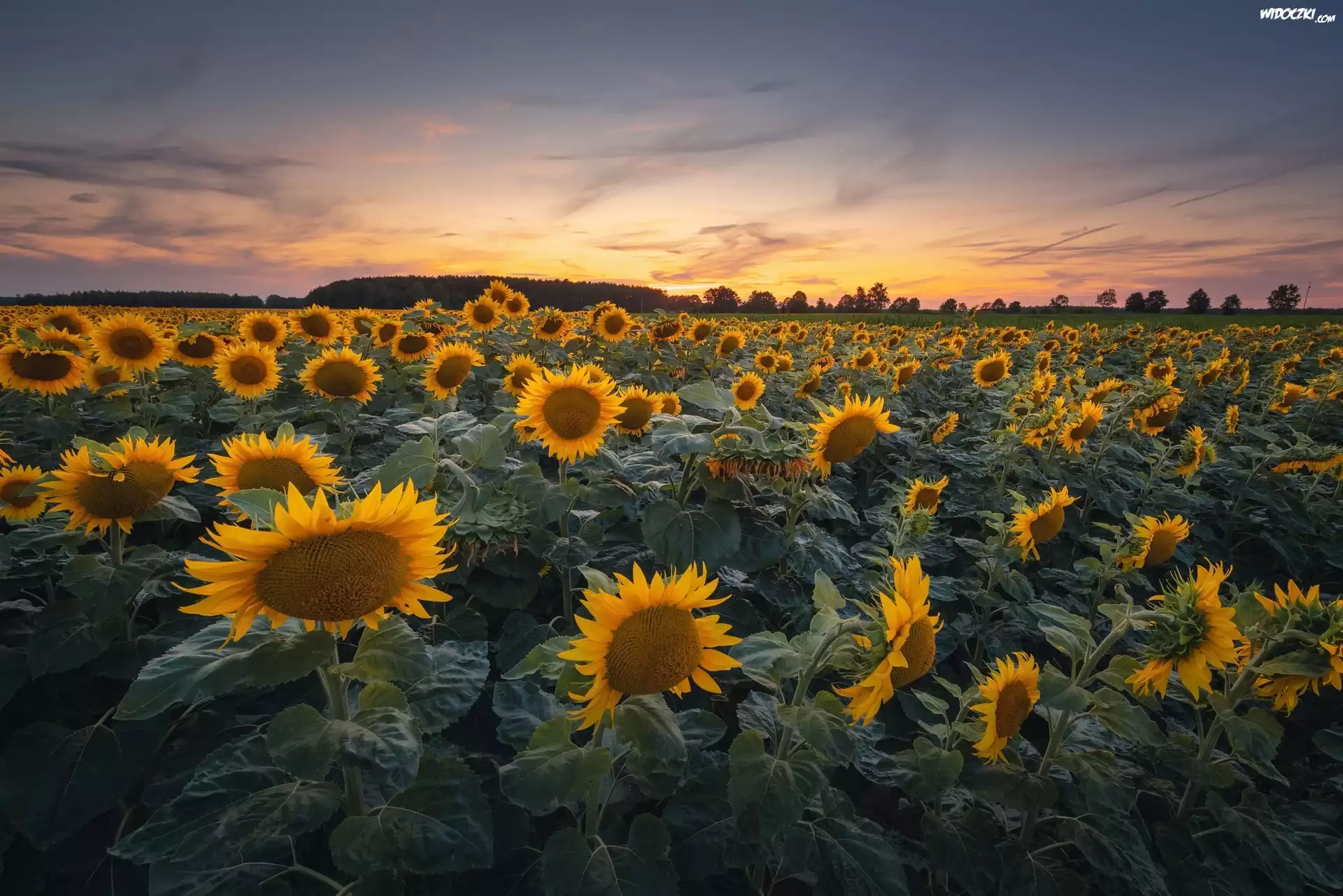 Kwiaty, Żółte, Słoneczniki, Pole, Plantacja, Zachód słońca