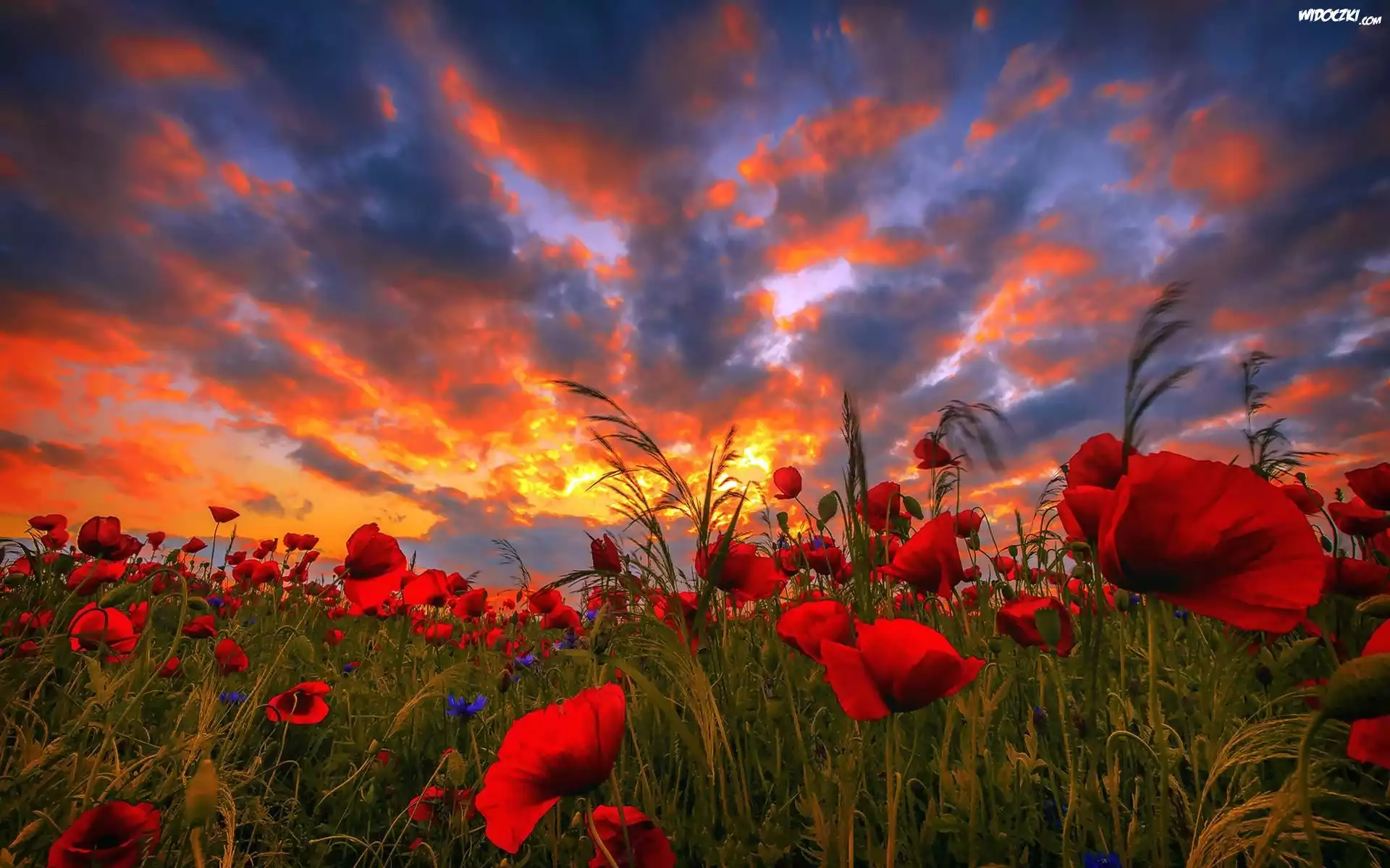 Zdjęcia, Pole, Maki, Trawa, Chmury