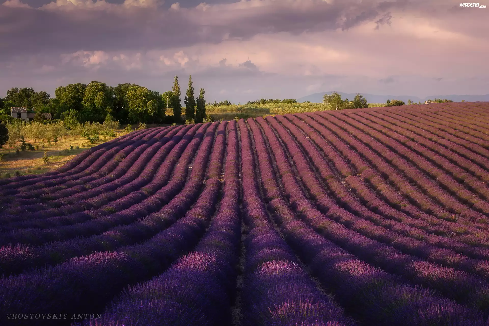 Zdjęcia, Pole, Lawenda, Uprawa, Drzewa