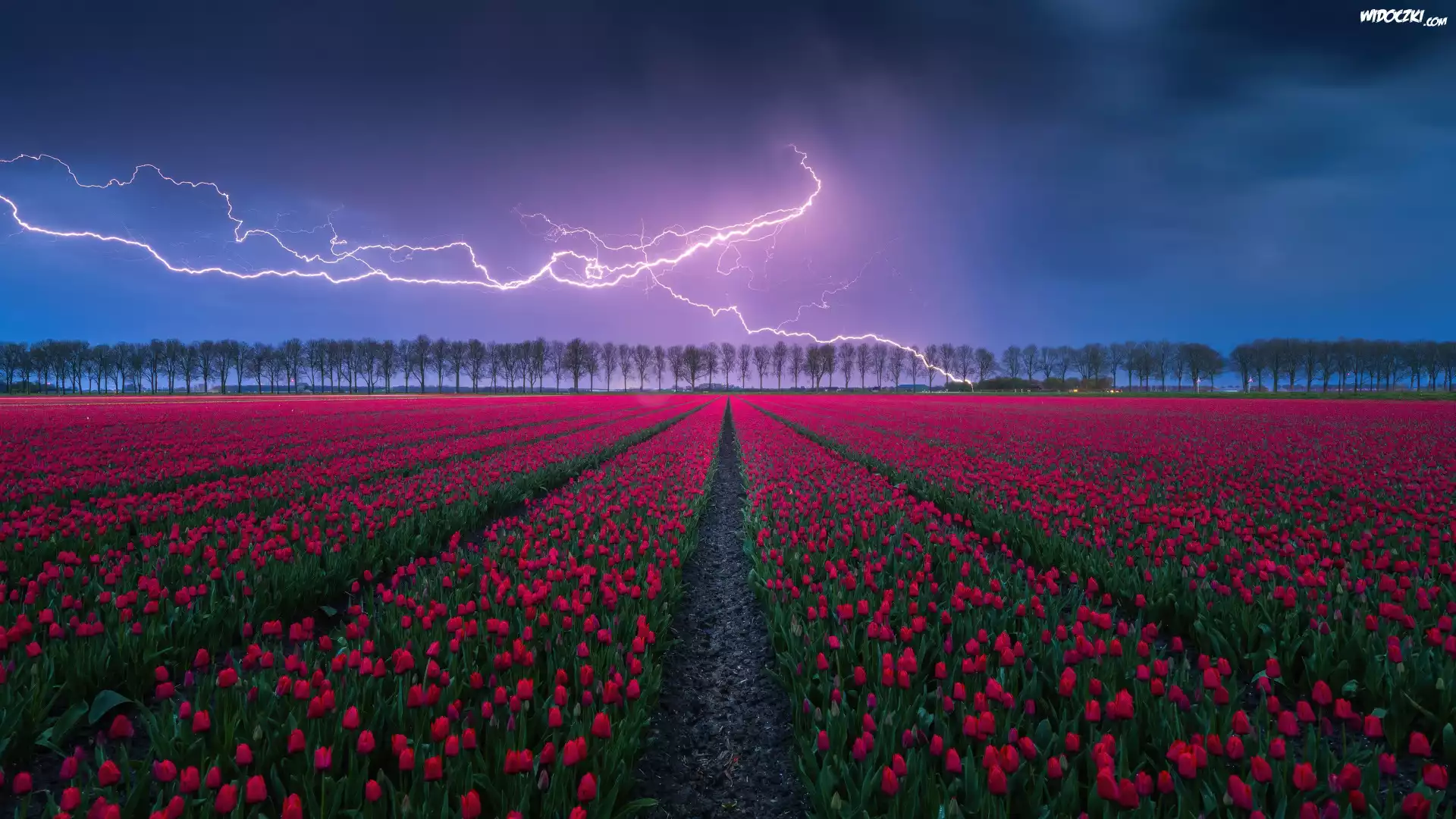 Zdjęcia, Niebo, Błyskawica, Wieczór, Pole, Kwiaty, Tulipany, Drzewa