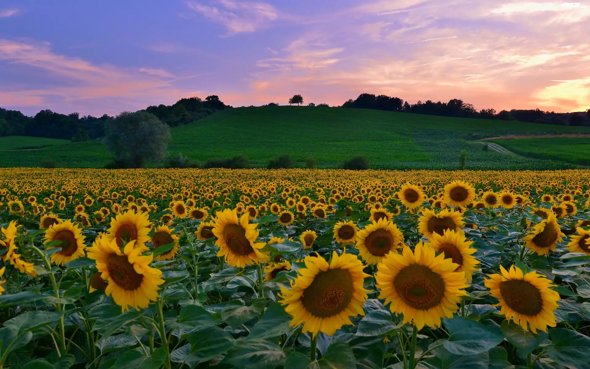 Pole, Słoneczników, Wzgórze, Drzewa