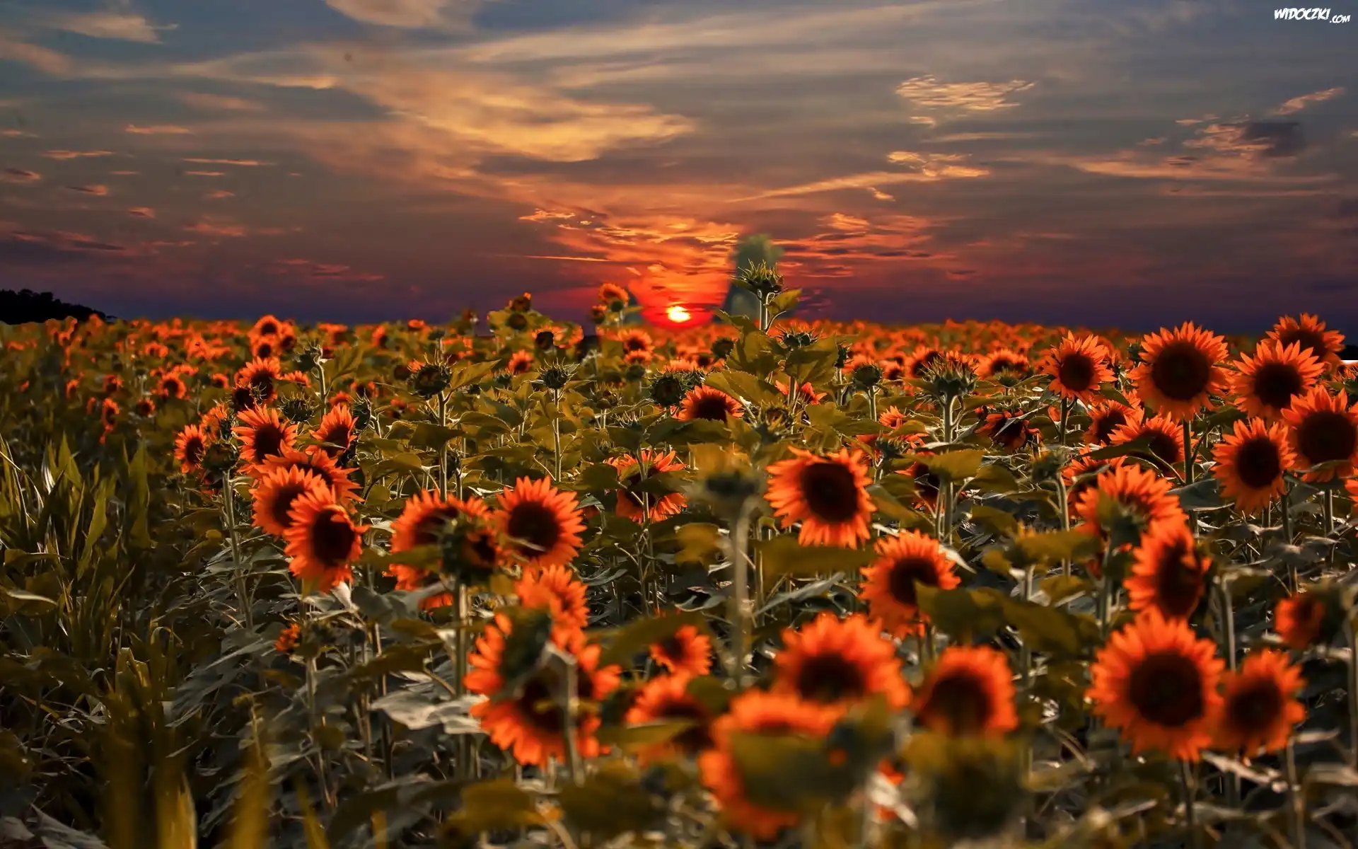 Pole, Słoneczników, Chmury, Zachód, Słońca