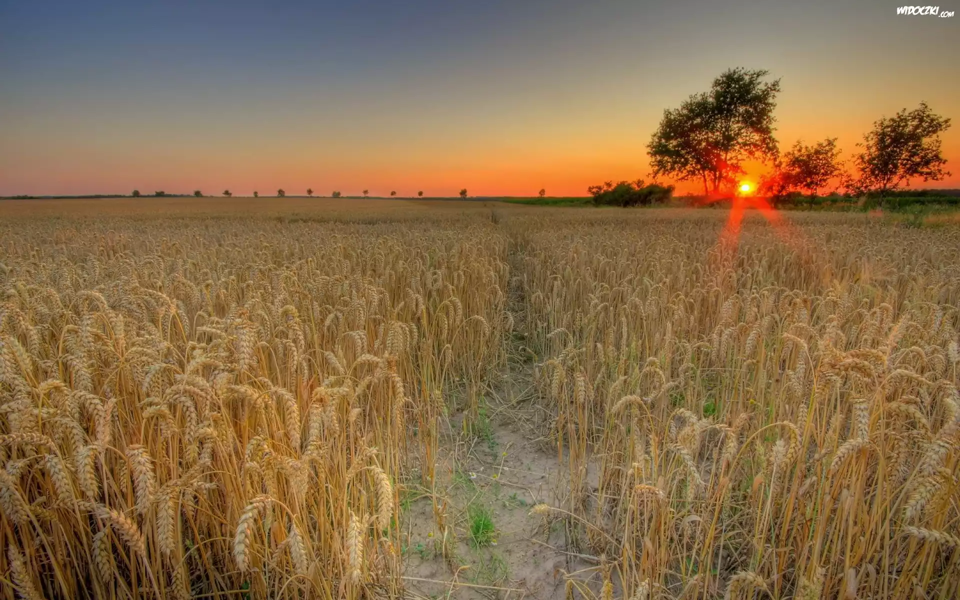 Zdjęcia, Pole, Zboże, Drzewa, Zachód, Słońca