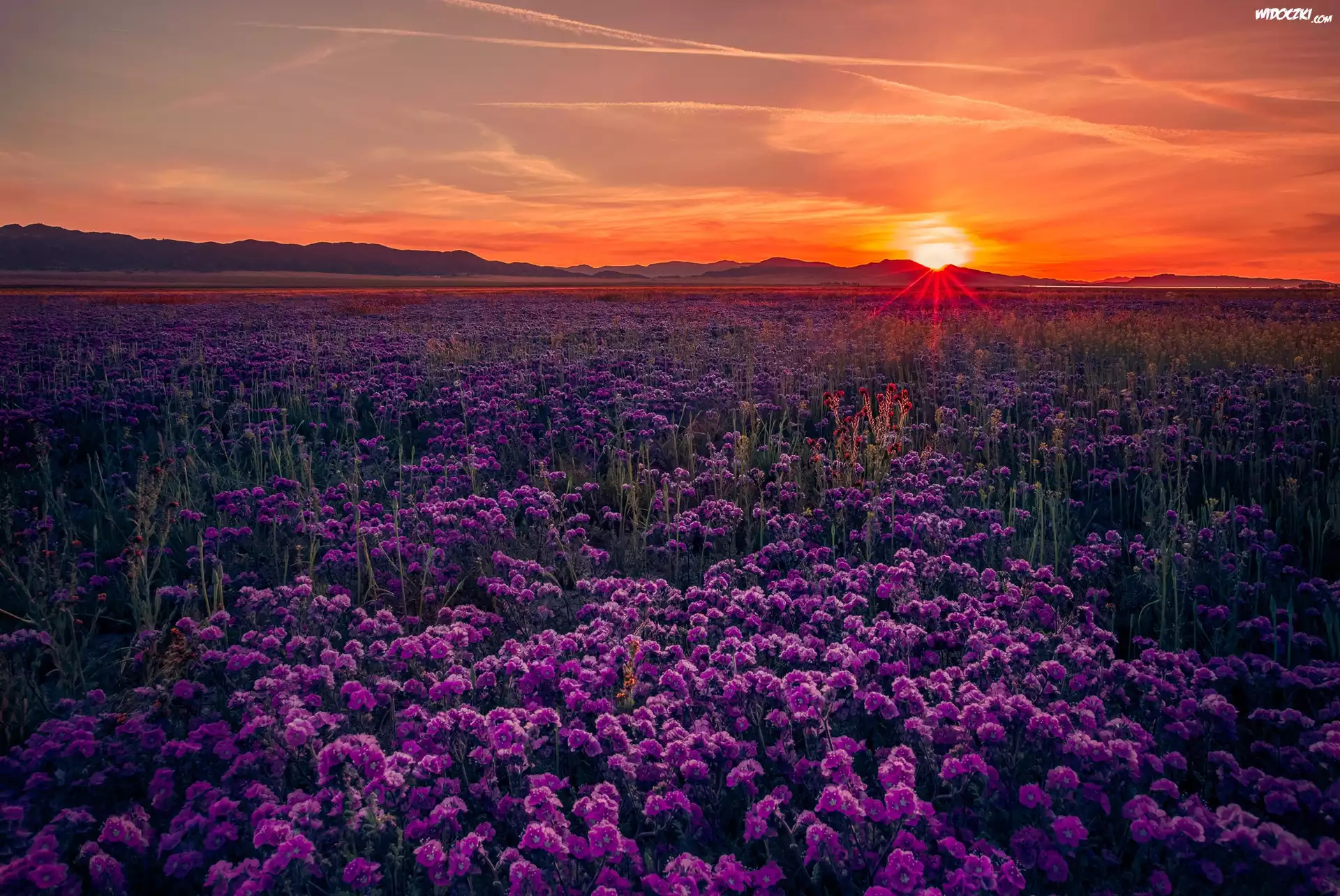 Pole, Kwiaty, Zachód, Słońca