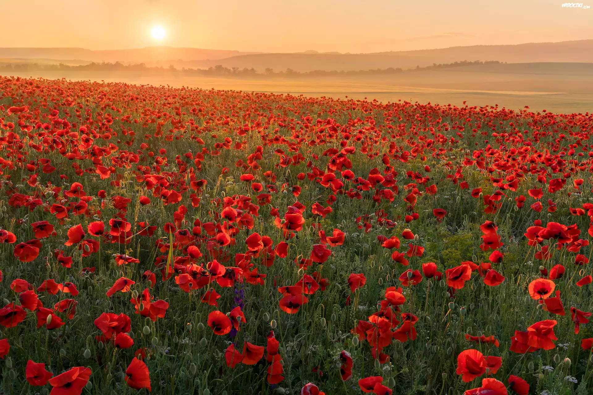 Zdjęcia, Pole, Łąka, Maki, Zachód słońca