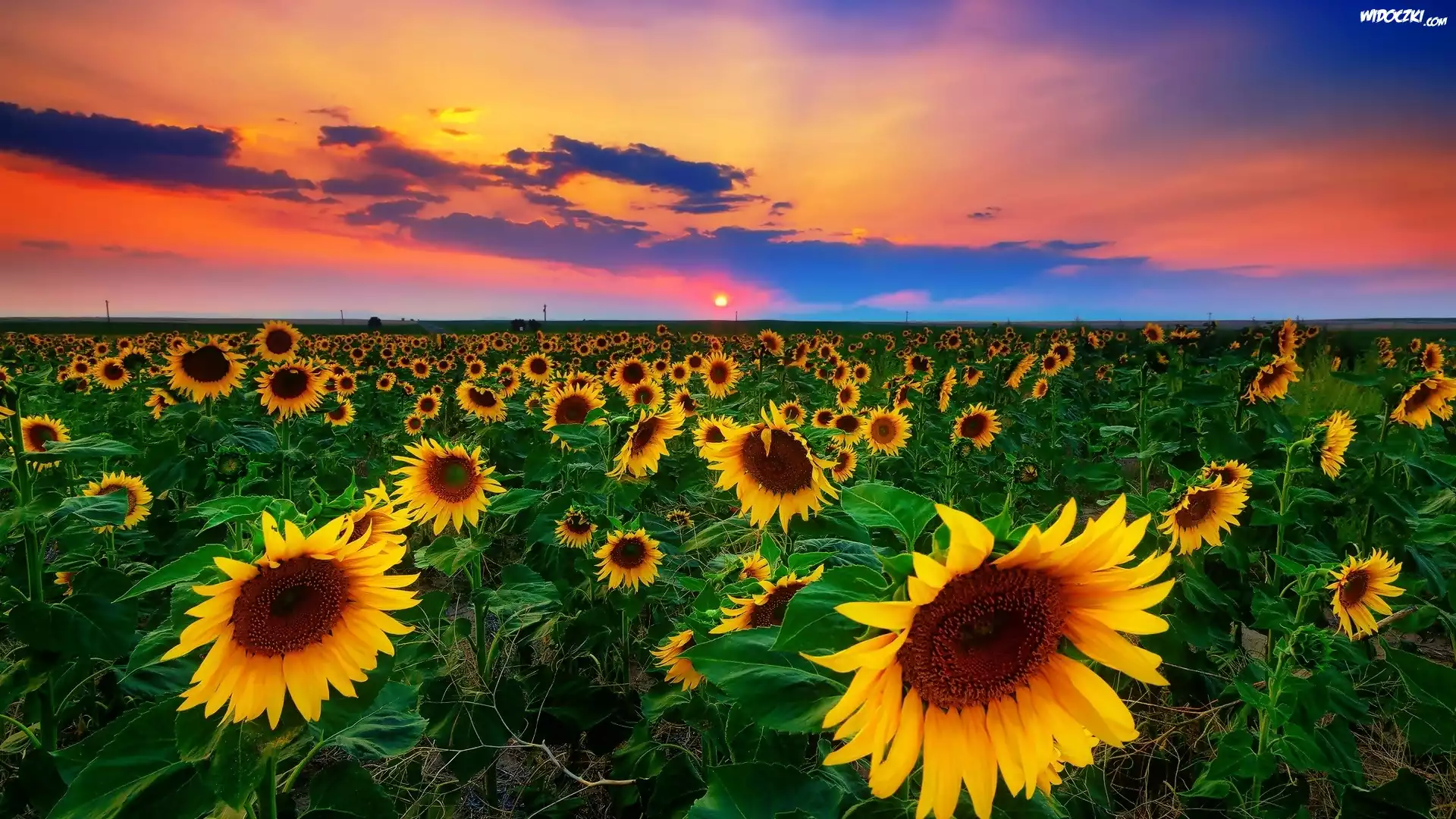 Pole, Słoneczniki, Piękny, Zachód, Słońca