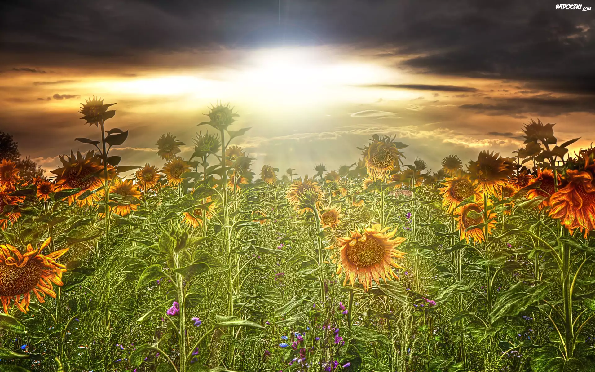 Zdjęcia, Pole, Słoneczników, Zachód, Słońca