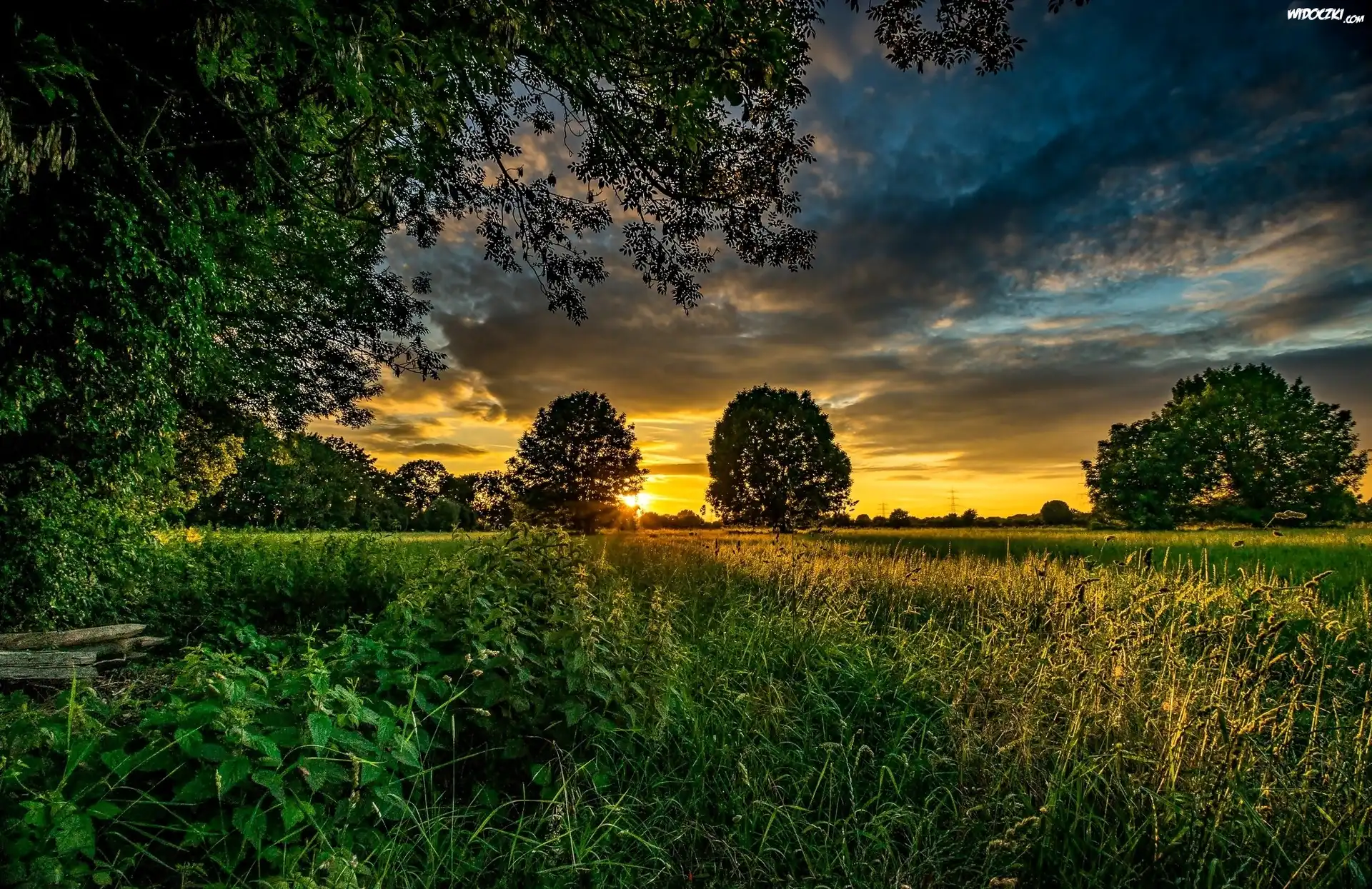 Pole, Drzewa, Trawa, Zachód, Słońca