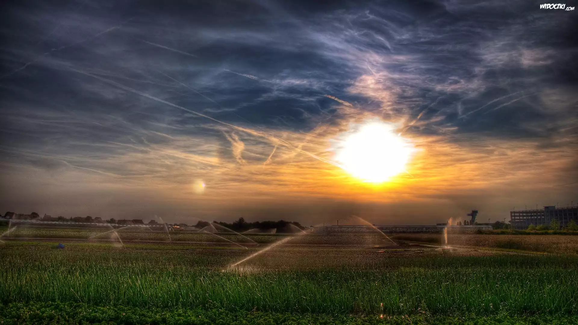 Zdjęcia, Pole, Zraszacze, Niebo, Zachodzące, Słońce