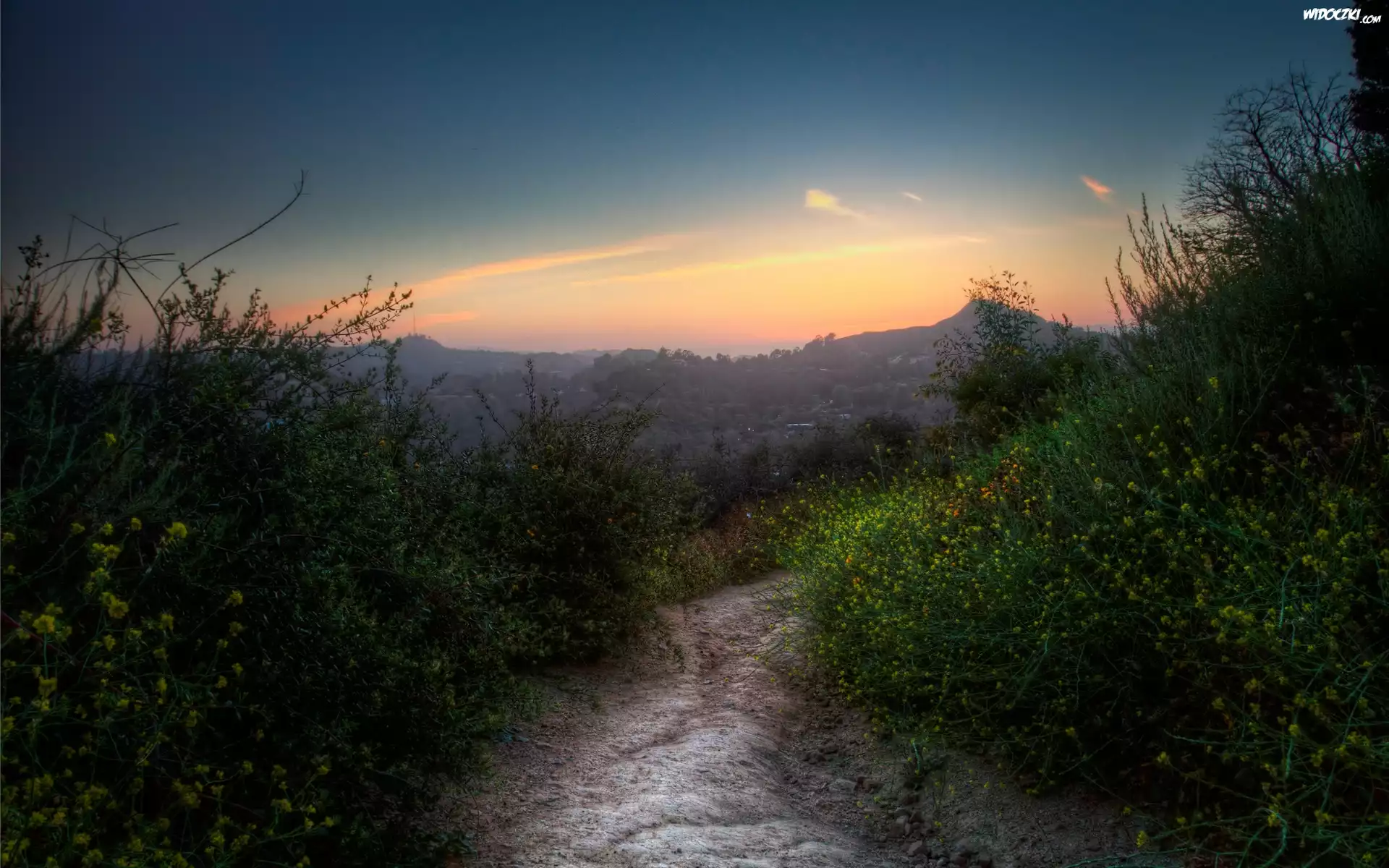Zdjęcia, Polna, Dróżka, Krzewy, Niebo