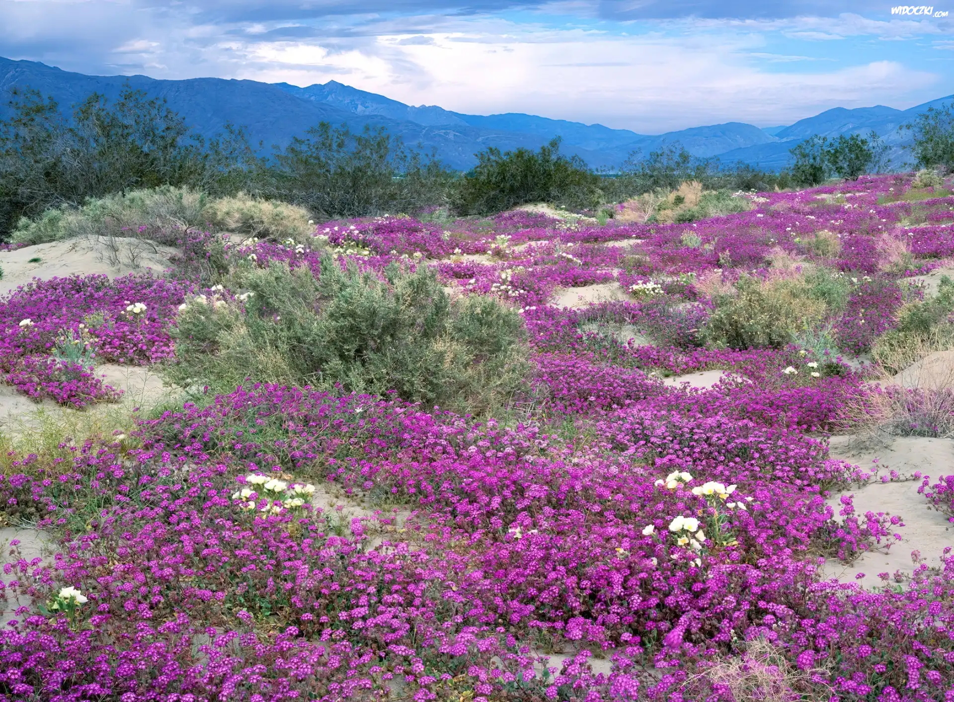 Polne, Kwiaty, Drzewa, Góry, Niebo
