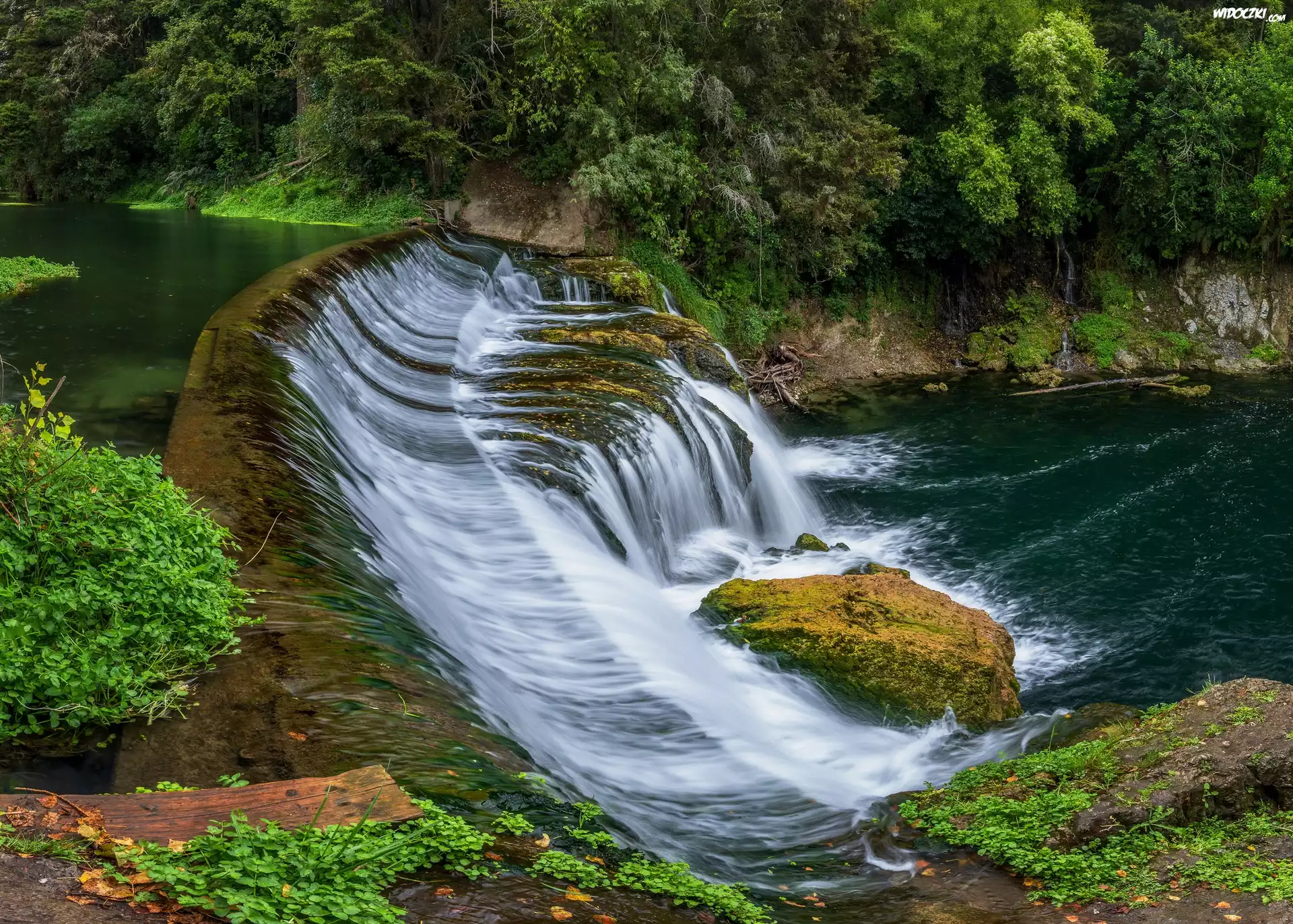 Nowa Zelandia, Wyspa Północna, Hastings, Rzeka, Wodospad, Maraetotara Falls, Skały, Mech, Drzewa, Roślinność |