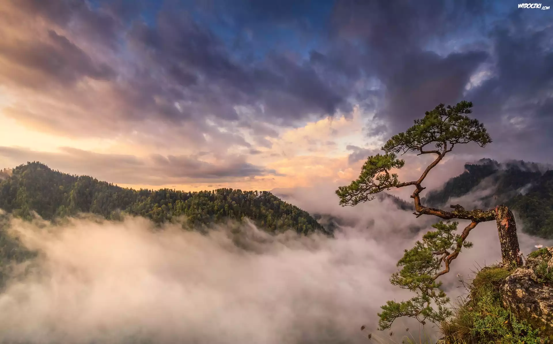 Góry, Mgła, Sosna, Skały, Las, Chmury, Szczyt, Sokolica, Pieniny, Polska