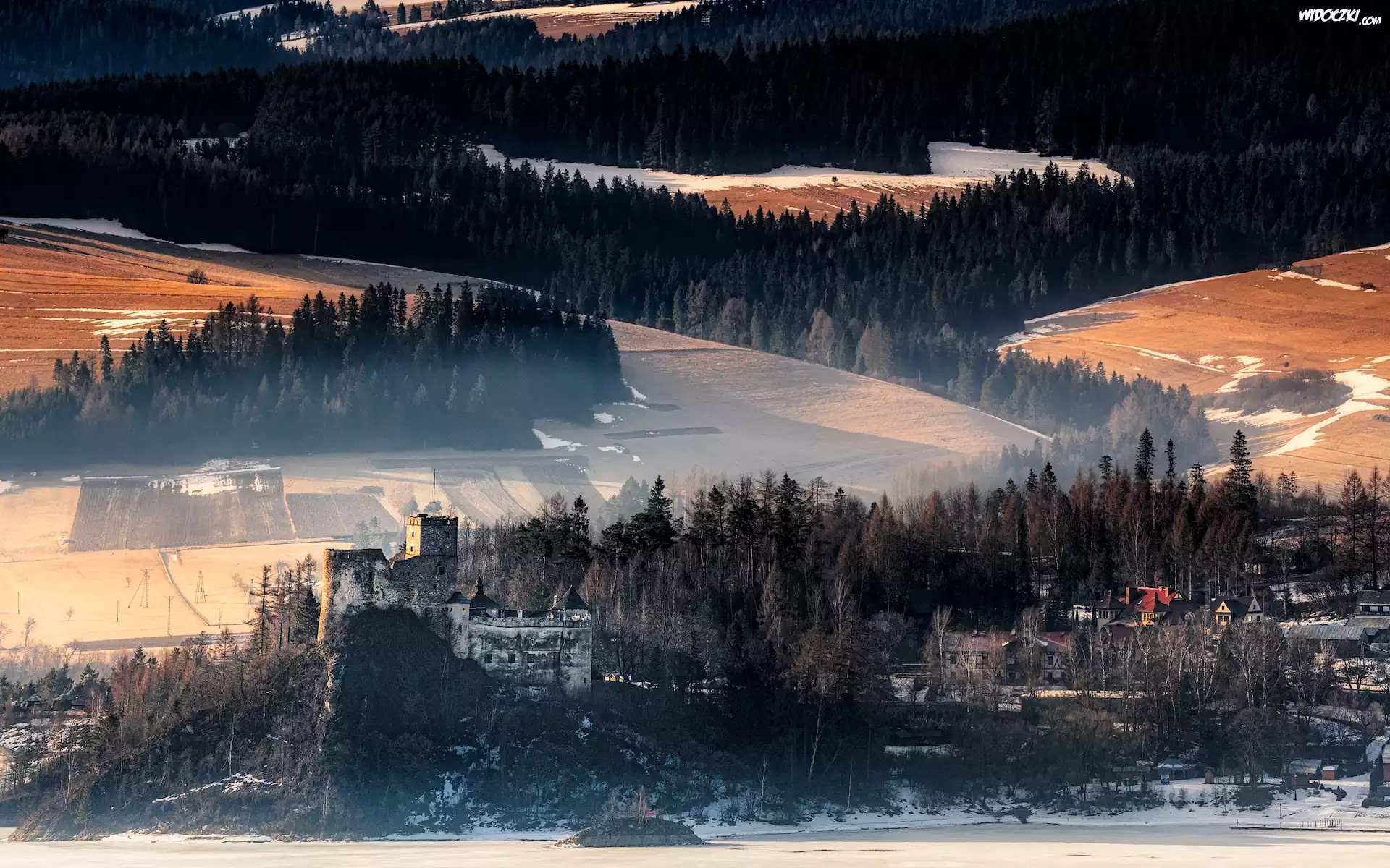 Polska, Powiat nowotarski, Wieś Niedzica-Zamek, Góry Pieniny, Drzewa, Las, Zima, Zamek Dunajec, Zamek w Niedzicy, Mgła, Pola |