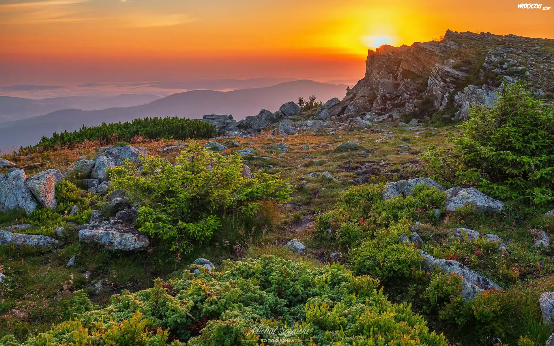 Zdjęcia, Polska, Góry, Beskidy, Babia Góra, Wschód słońca, Skały, Roślinność