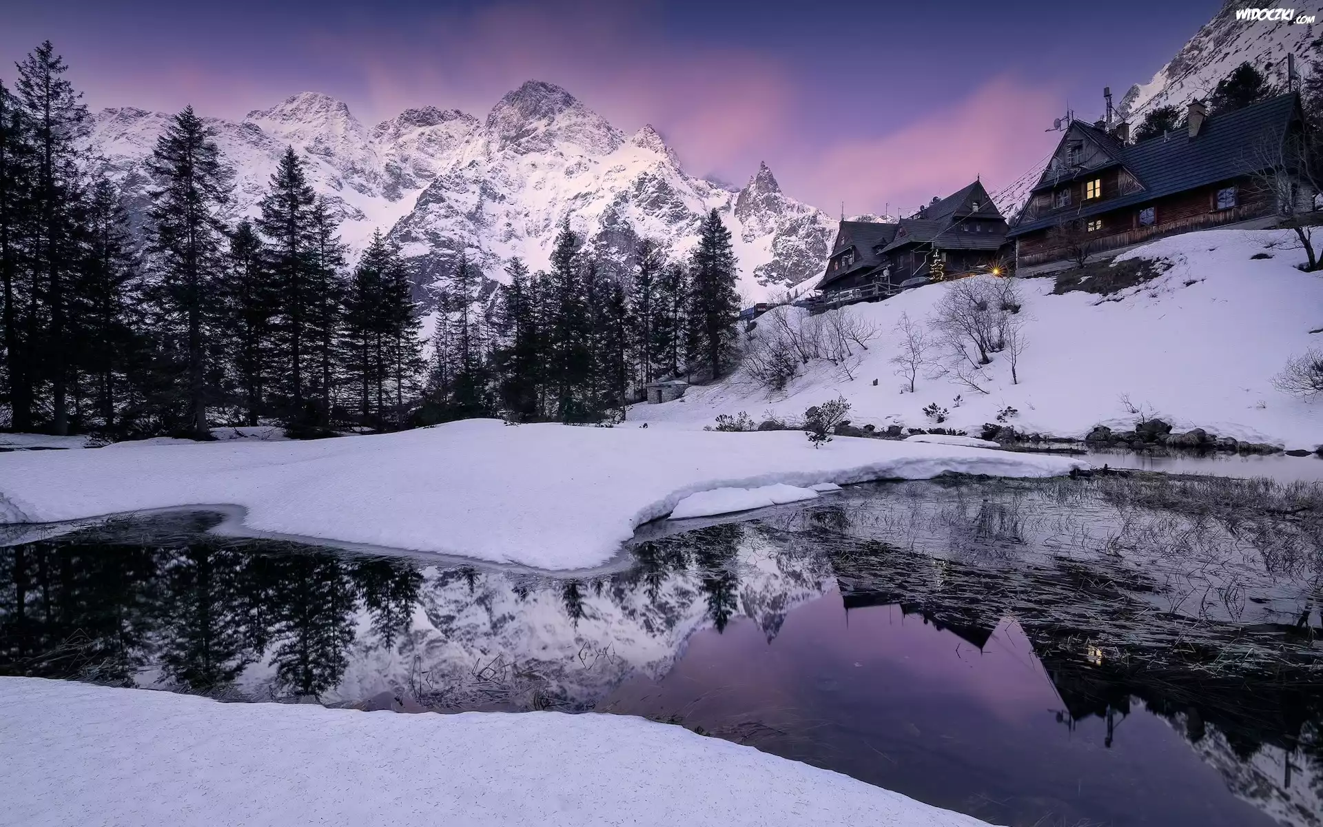 Zdjęcia, Polska, Góry, Tatry, Jezioro, Morskie Oko, Zima, Drzewa, Domy