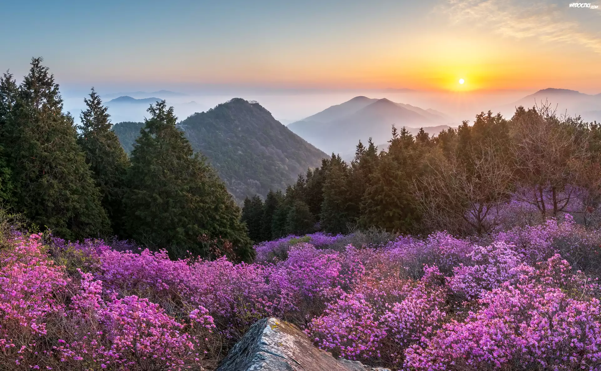 Kwiaty, Góry, Góra Cheonjusan, Drzewa, Wschód słońca, Mgła, Korea Południowa