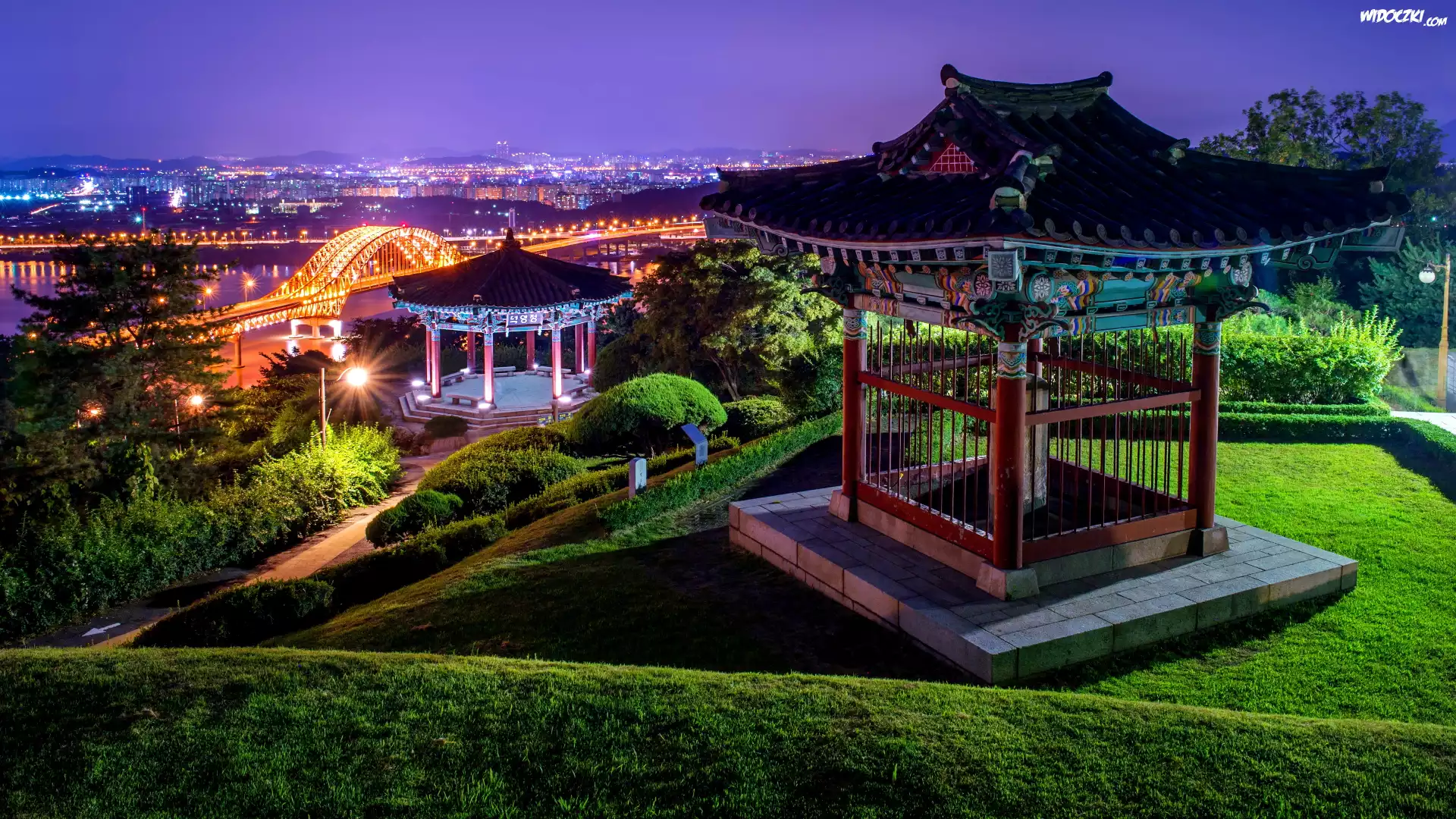 Zdjęcia, Park Haengjusanseong, Altany, Oświetlony, Most, Banghwa Bridge, Goyang, Korea Południowa