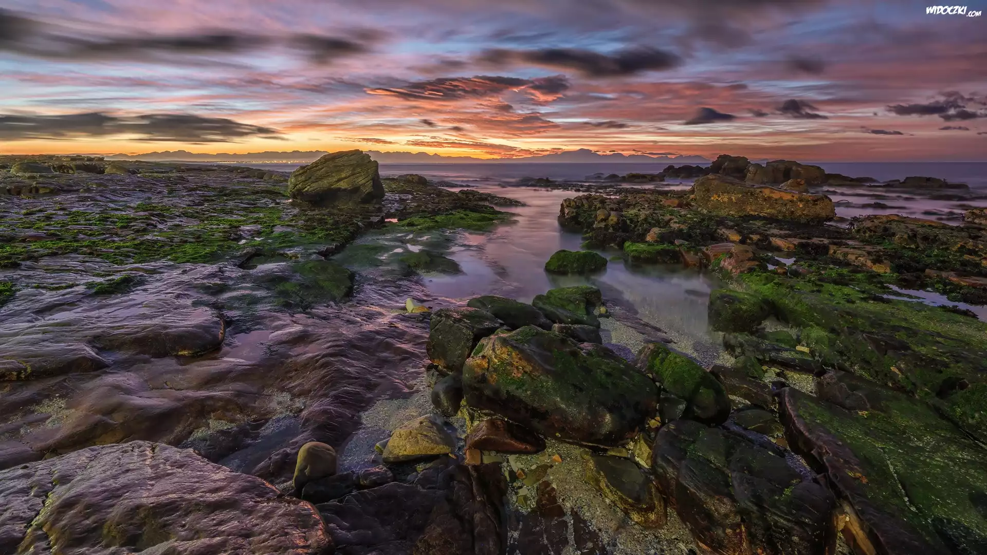 Wschód słońca, Skały, Omszała, Morze, Muizenberg, Przylądek Zachodni, Republika Południowej Afryki, Afryka |