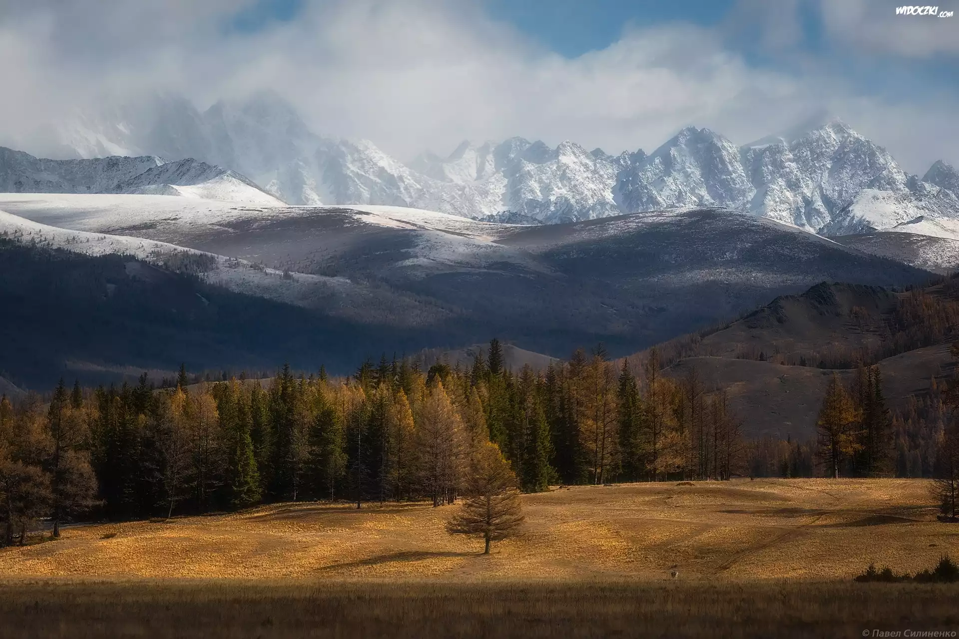 Góry Południowoczujskie, Ośnieżone, Szczyty, Jesienne, Drzewa, Ałtaj, Rosja
