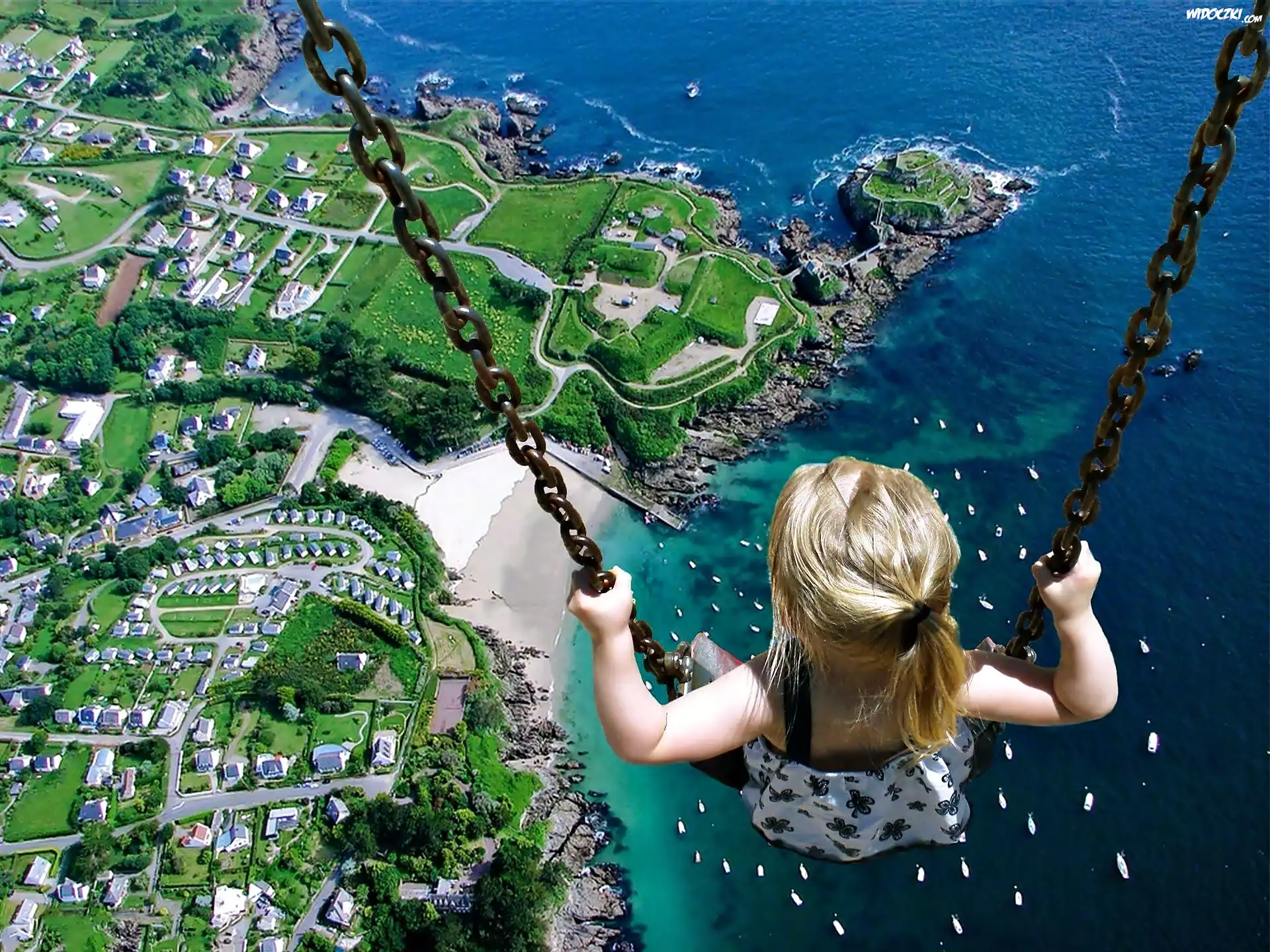 Zdjęcia, Krajobraz, Półwysep, Z lotu ptaka, Dziecko, Huśtawka