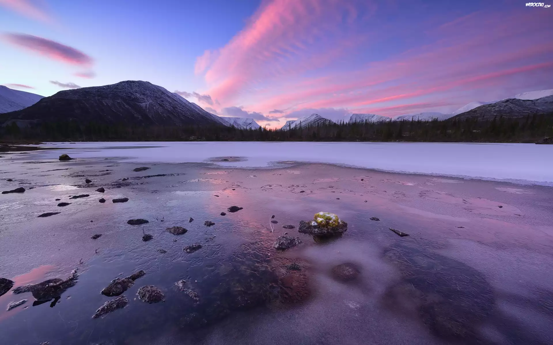 Góry Chibiny, Półwysep Kolski, Rosja, Świerki, Zamarzające, Jezioro, Kolorowe, Niebo, Zima