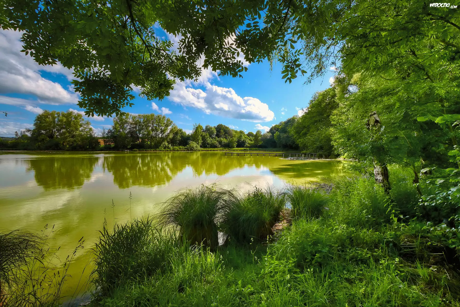 Jezioro, Pomost, Drzewa, Trawy, Roślinność, Słoneczny, Dzień, Lato