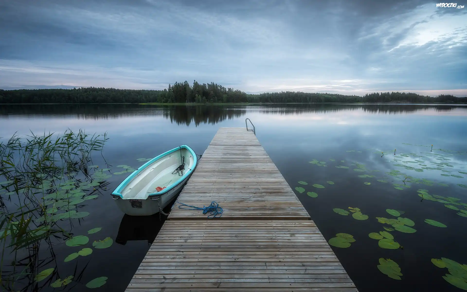 Drewniany, Pomost, Jezioro, Muskan Lake, Łódka, Trawa, Szwecja