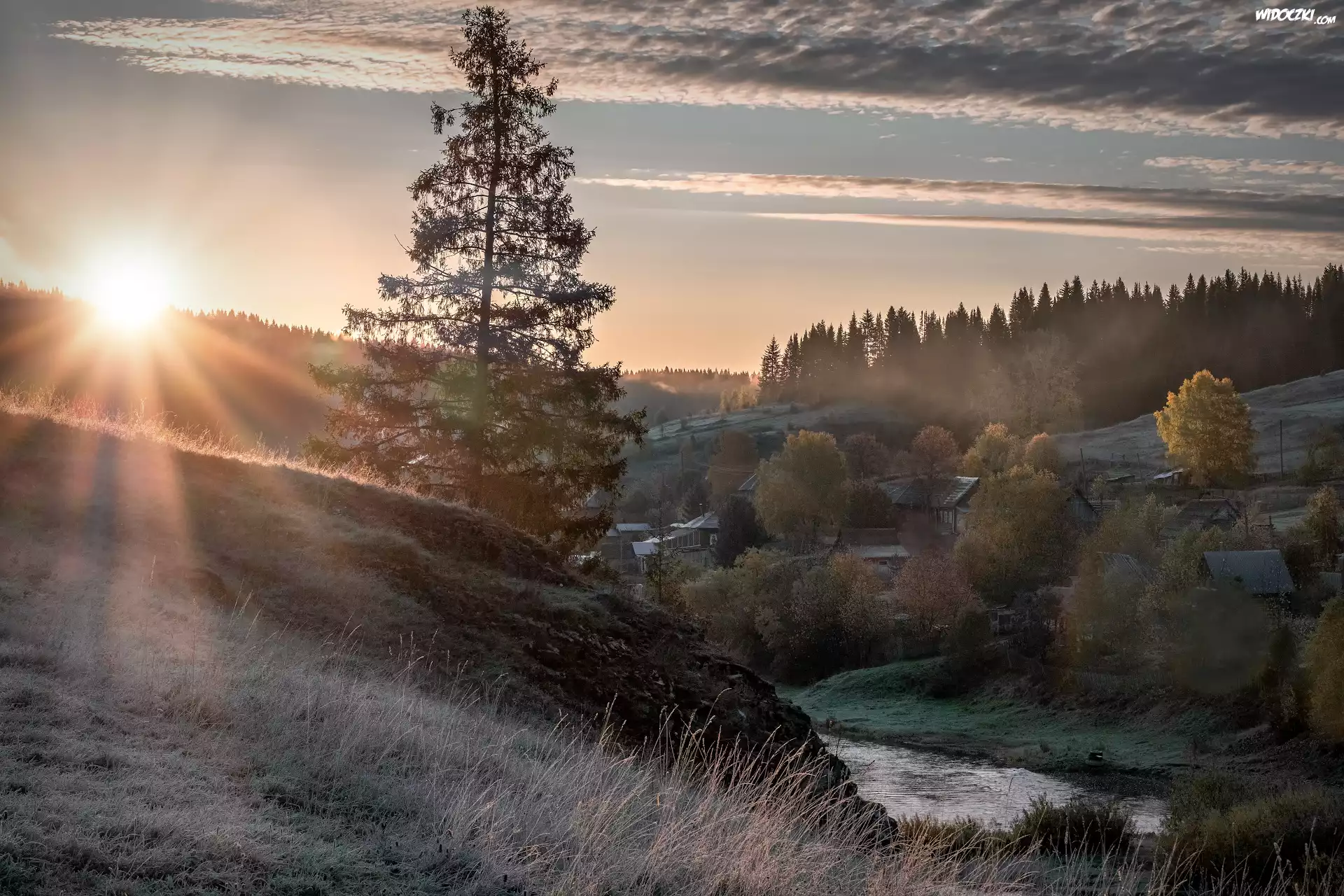 Zdjęcia, Poranek, Wschód słońca, Drzewa, Domy