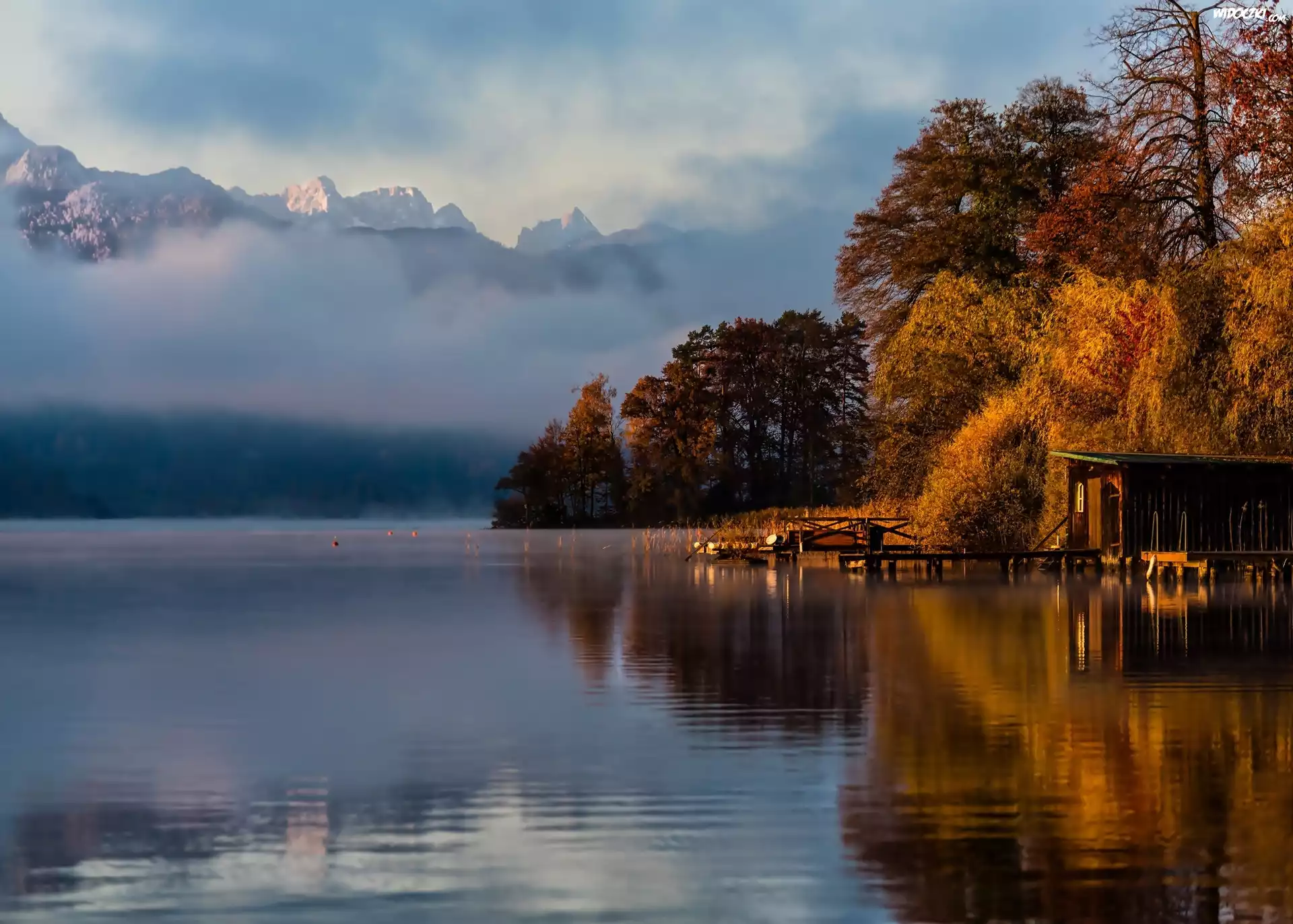 Jezioro, Poranek, Mgła, Góry, Drzewa, Pomost, Jesień