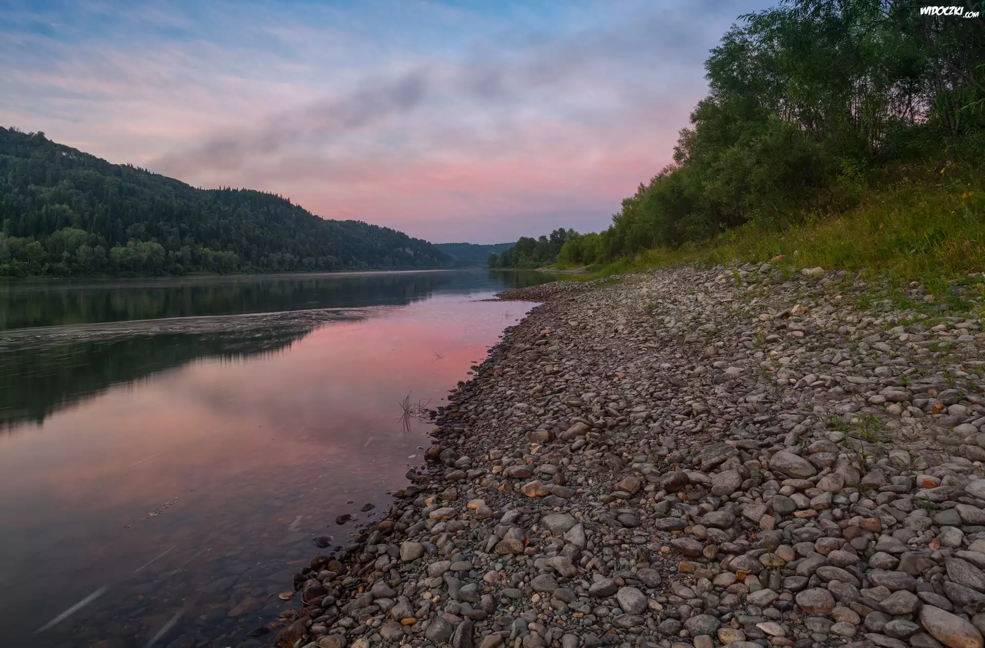 Zdjęcia, Poranek, Rzeka, Kamienie, Drzewa