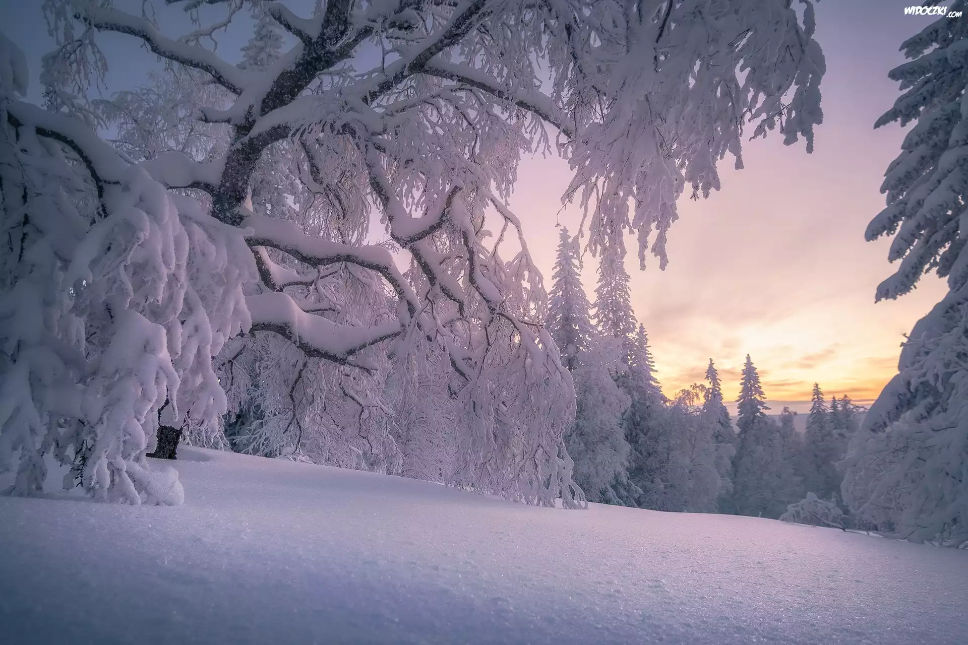 Zdjęcia, Zima, Poranek, Las, Ośnieżone, Drzewa