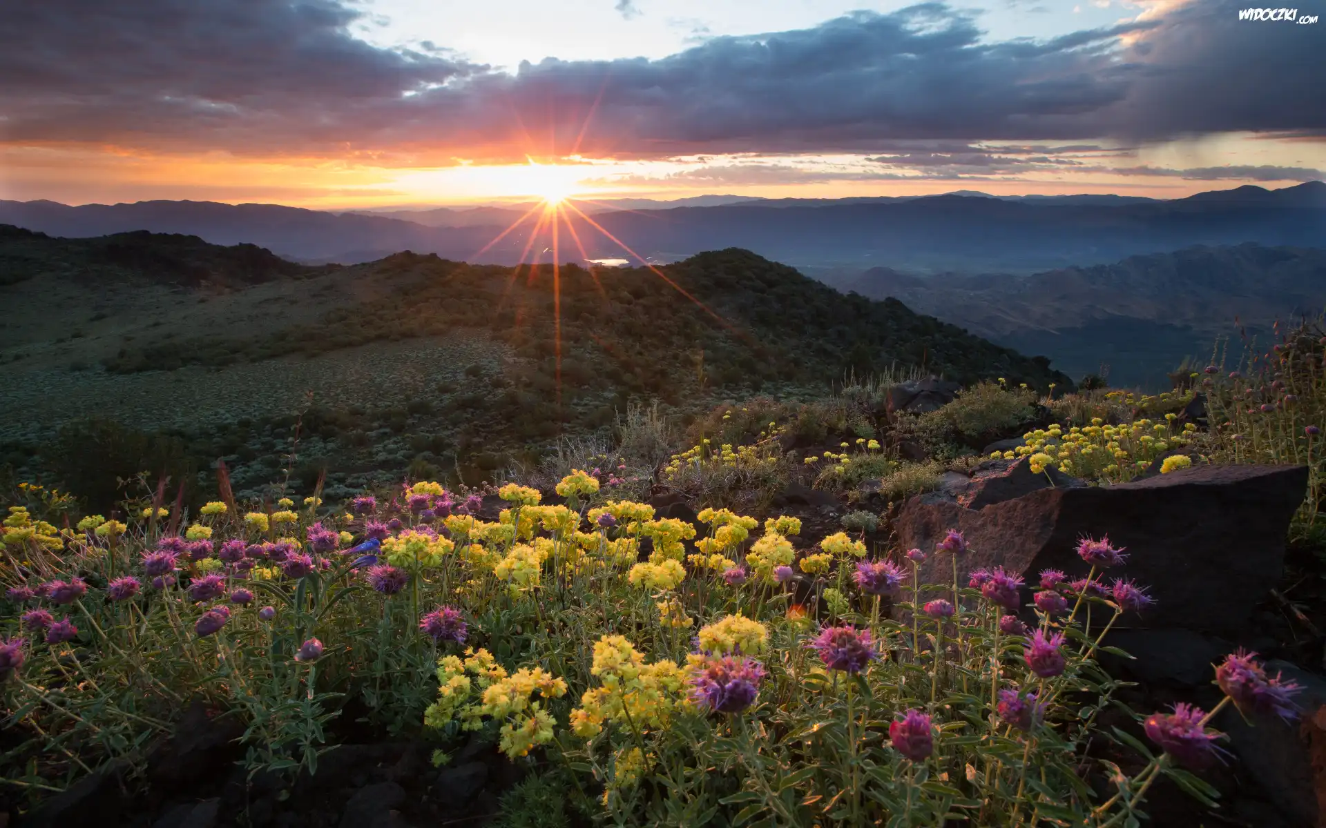 Zdjęcia, Góry, Kwiaty, Wzgórza, Poranek, Chmury, Wschód słońca