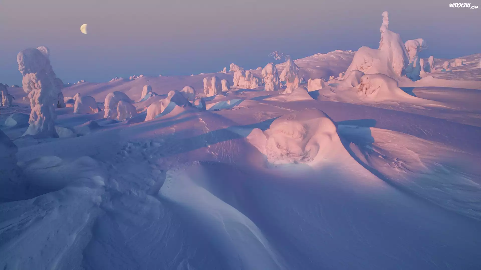 Zima, Śnieg, Wzgórza, Ośnieżone, Drzewa, Zaspy, Księżyc, Poranek